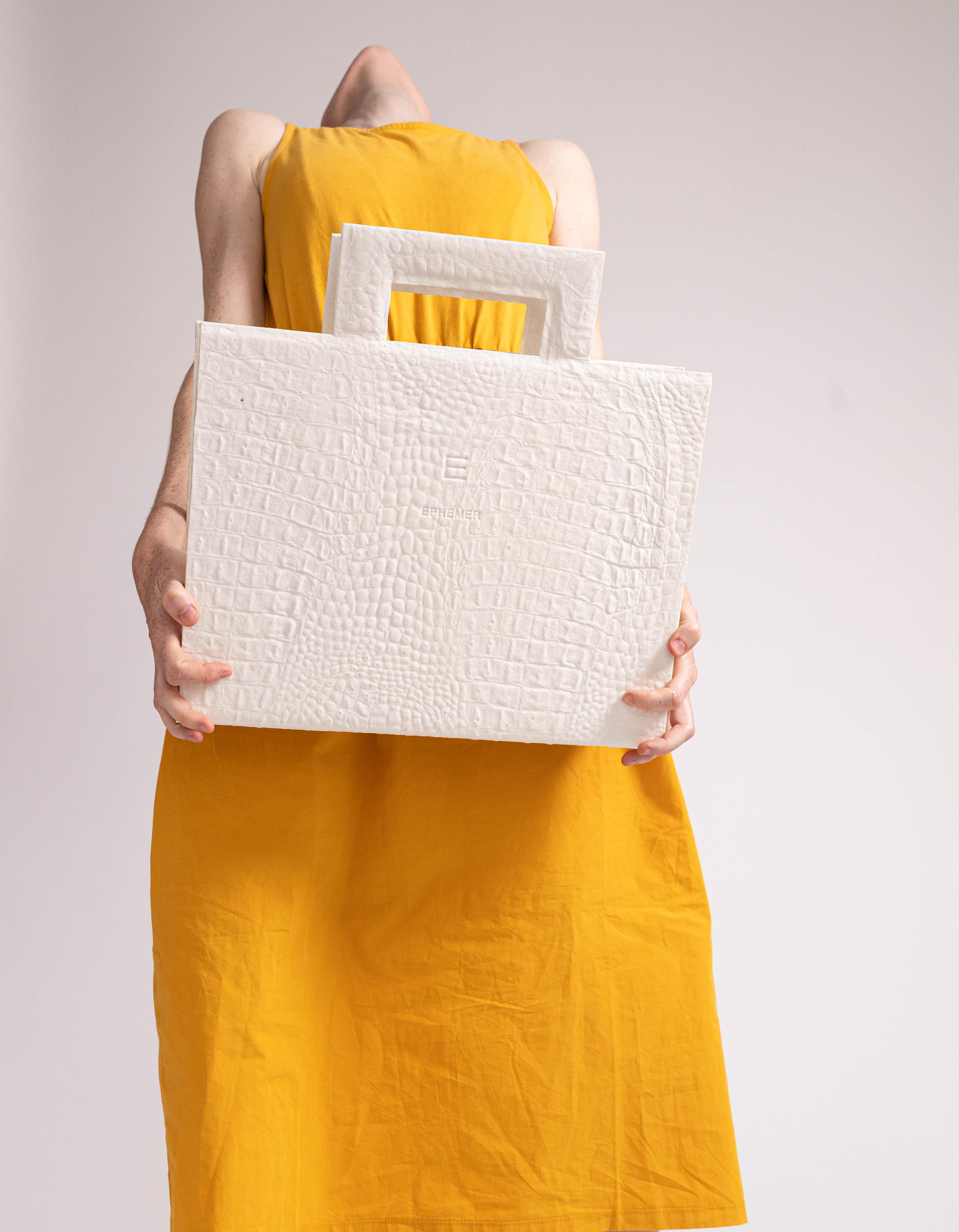 Mir ist aufgefallen, dass das Papier bzw. die bei den Experimenten entstandenen Ergebnisse wie weisses Leder aussehen. Es machte also keinen Sinn, dass die Taschen 1:1 wie Originale aussehen. Es musste eine Abstraktion stattfinden, damit das Papier und somit das Vergängliche erkennbar wird. An dieser Stelle sehe ich meinen Eingriff als Designer. Wie kann ich das Vergängliche sichtbar machen?