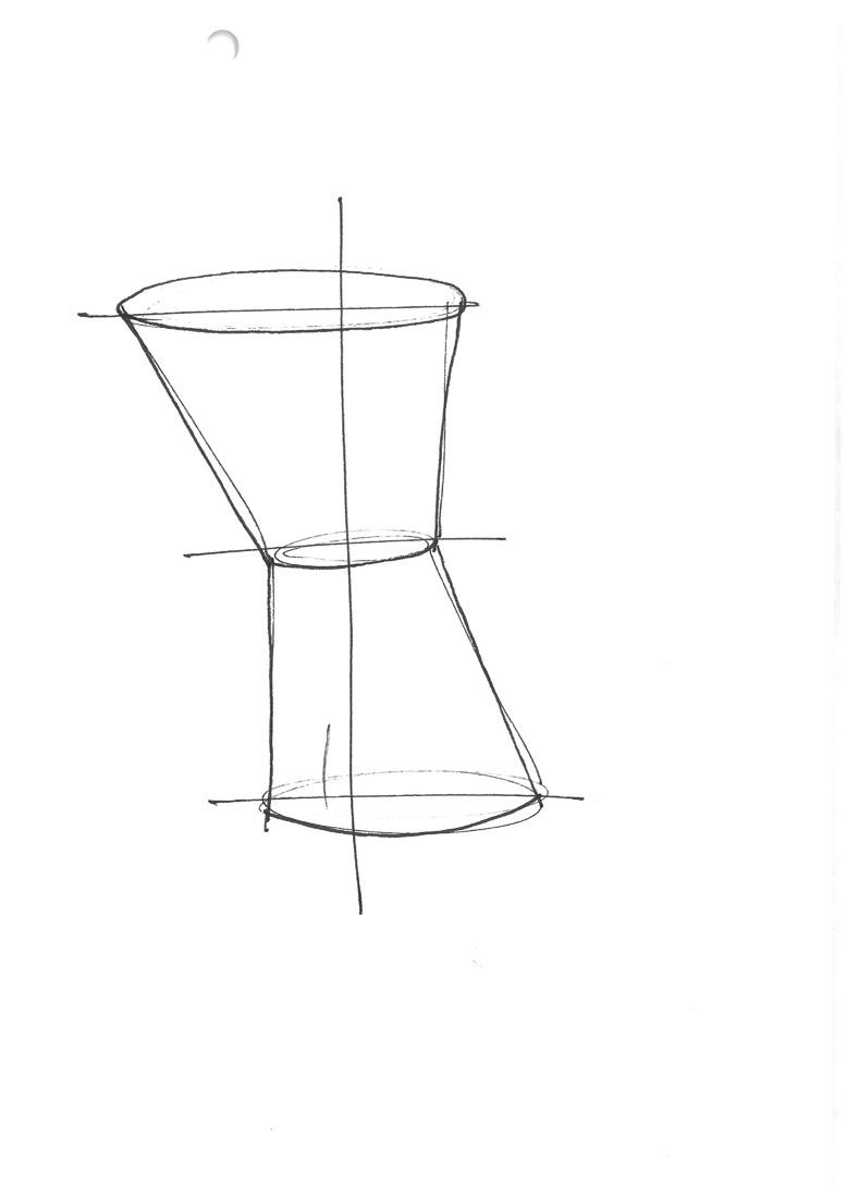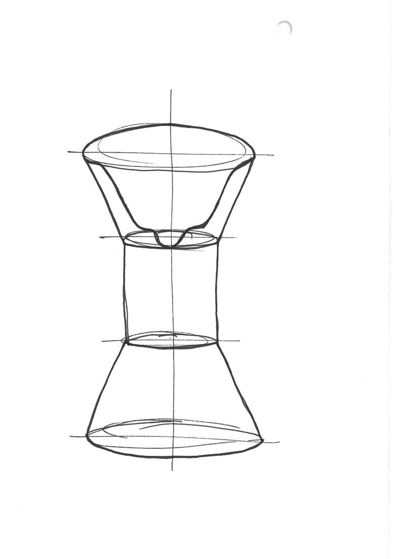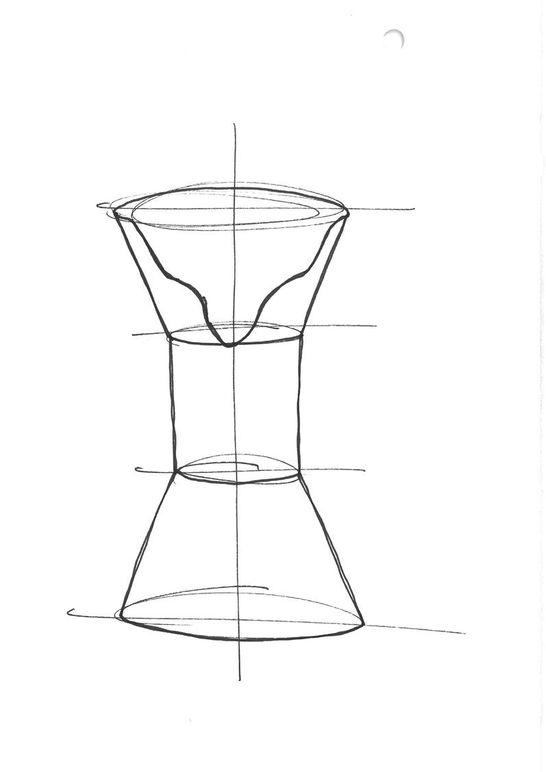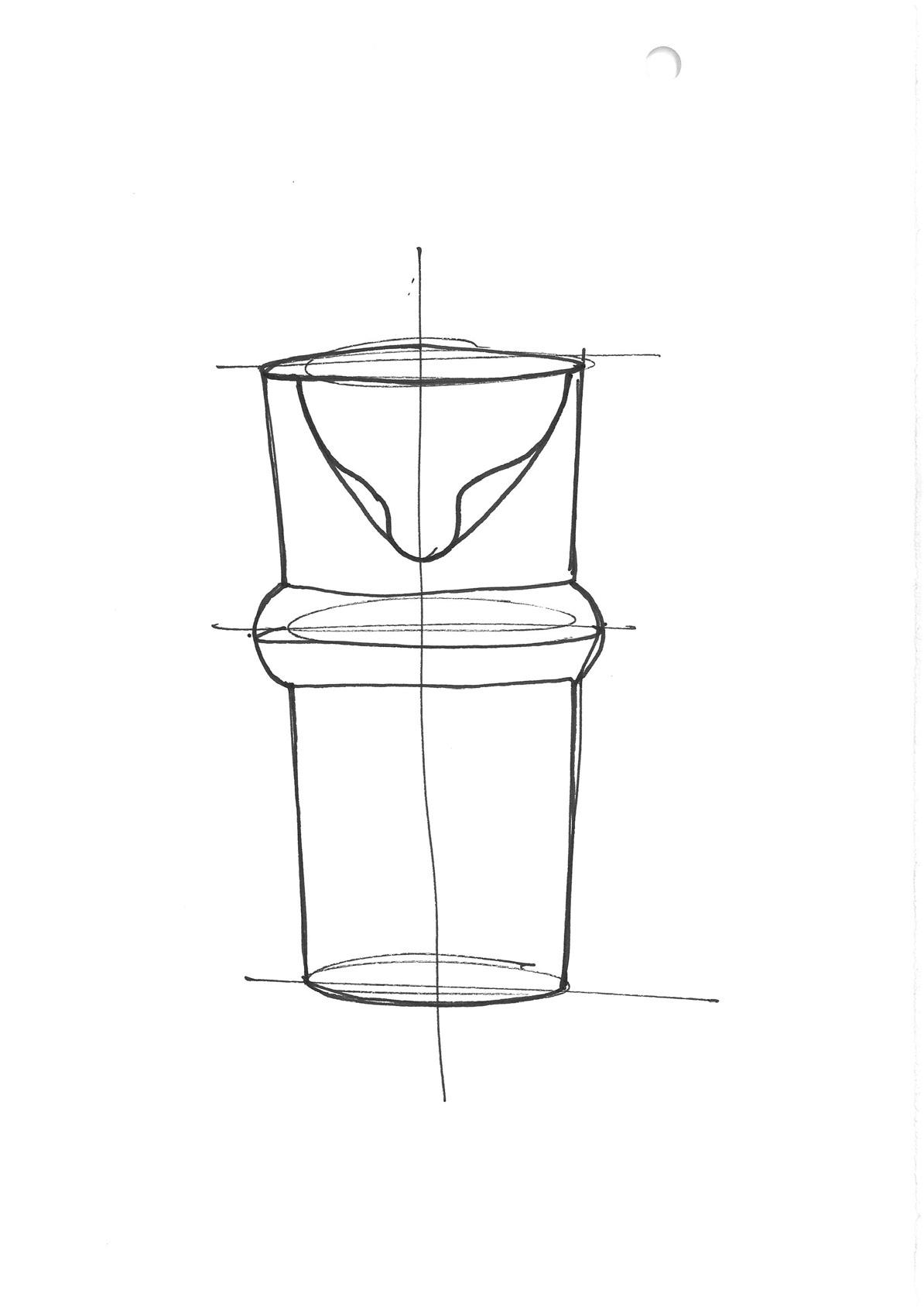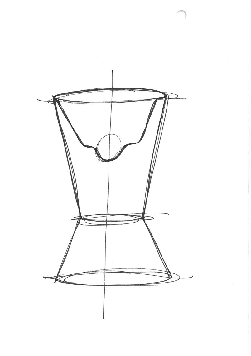Aus den ersten Skizzen heraus lässt sich Folgendes herauskristallisieren: Erstens kann ein Nasenausschnitt sichtbar sein, also als Gestaltungsmerkmal dienen, oder er kann verdeckt sein. Dies kann durch eine abgeschrägte Trinkkante erreicht werden.