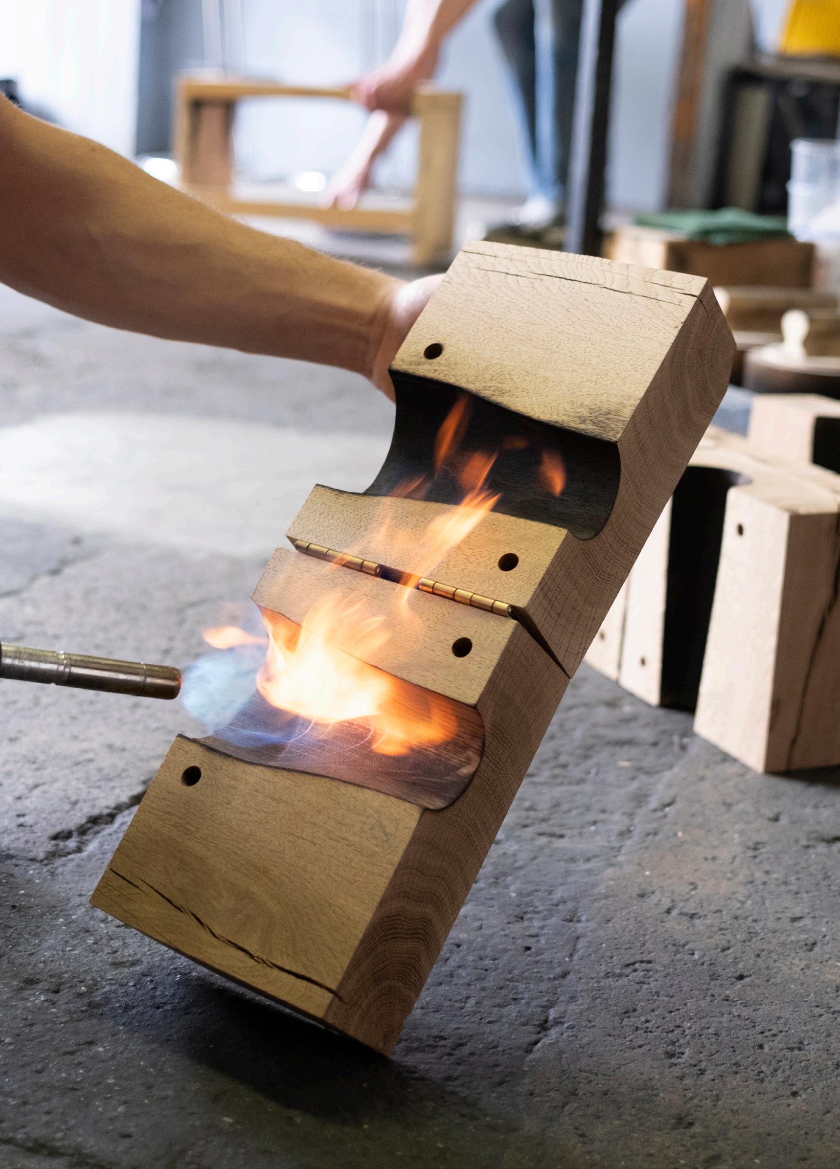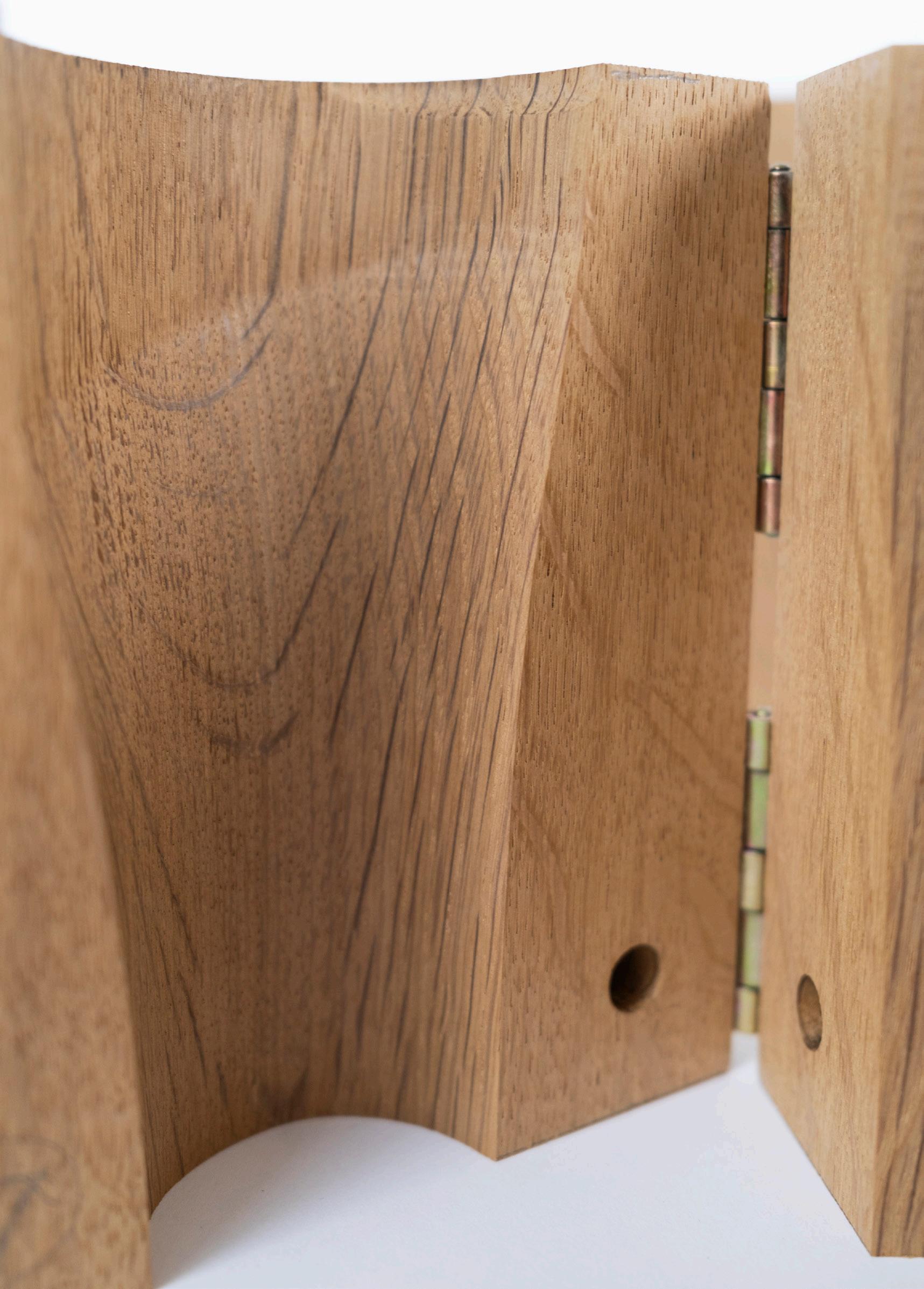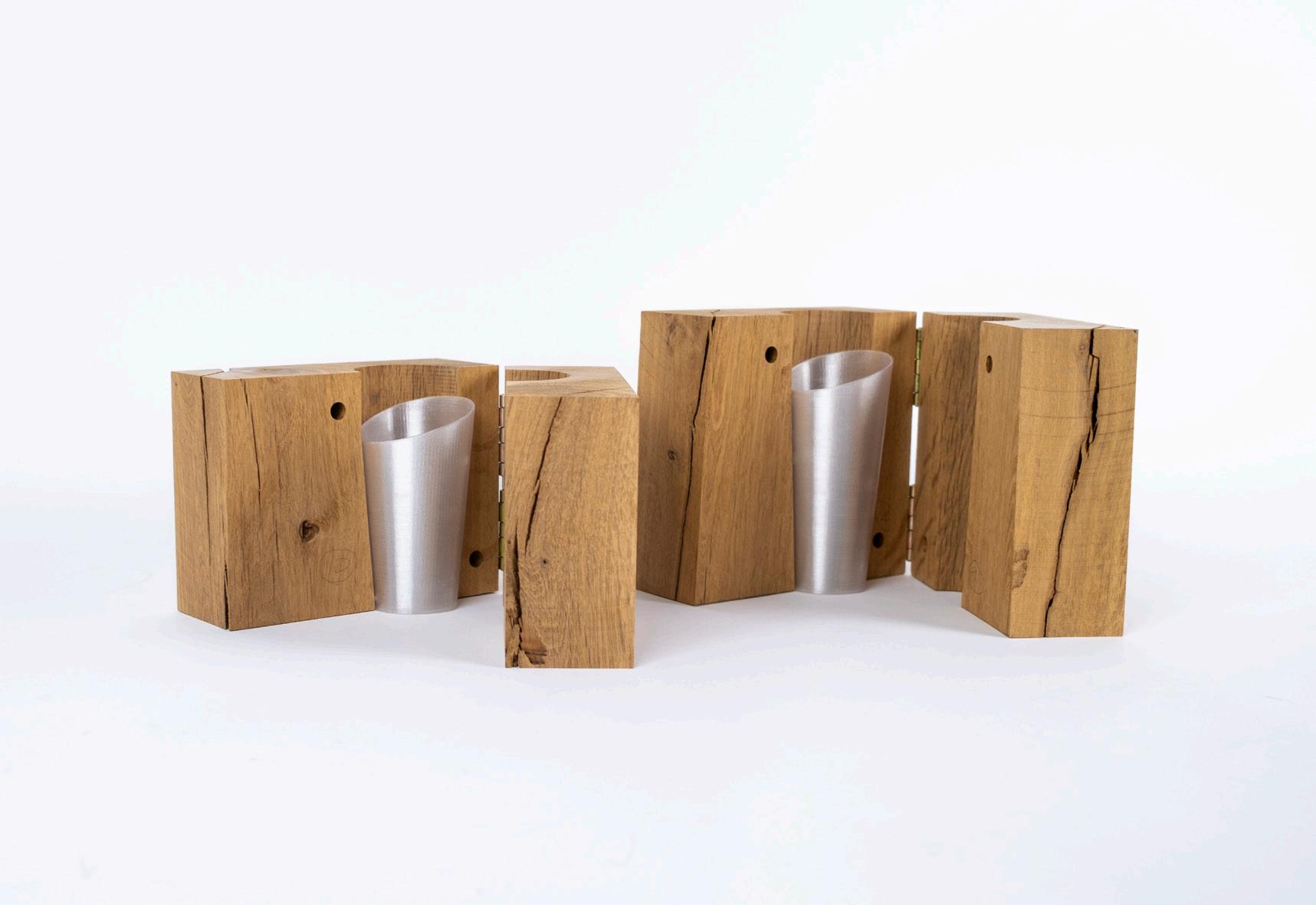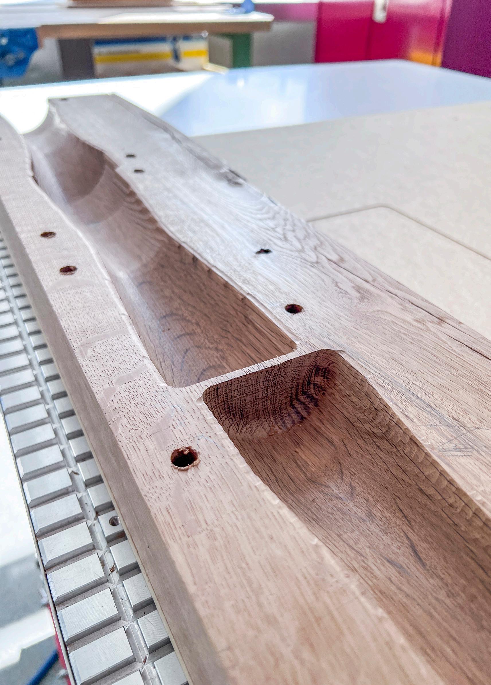 Formsprache in Glas realisieren zu können, habe ich als erstes ein Eichenholzbrett als Grundlage verwendet. Diese habe ich bearbeitet und auf der CNC die Negativformen eingefräst. Danach von Hand geschliffen und mithilfe von Dübeln miteinander verbunden, ausgerichtet und schliesslich die Scharniere montiert.