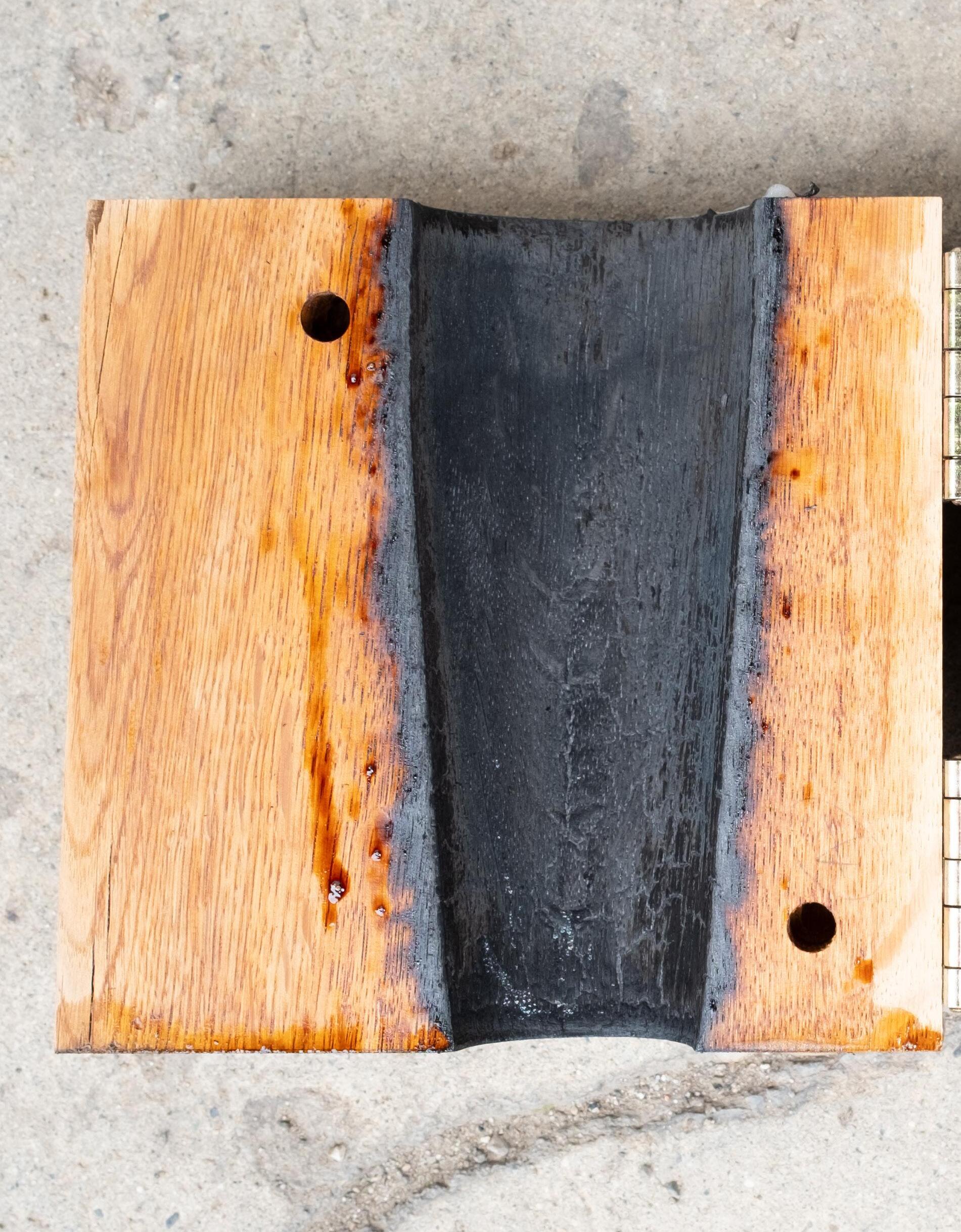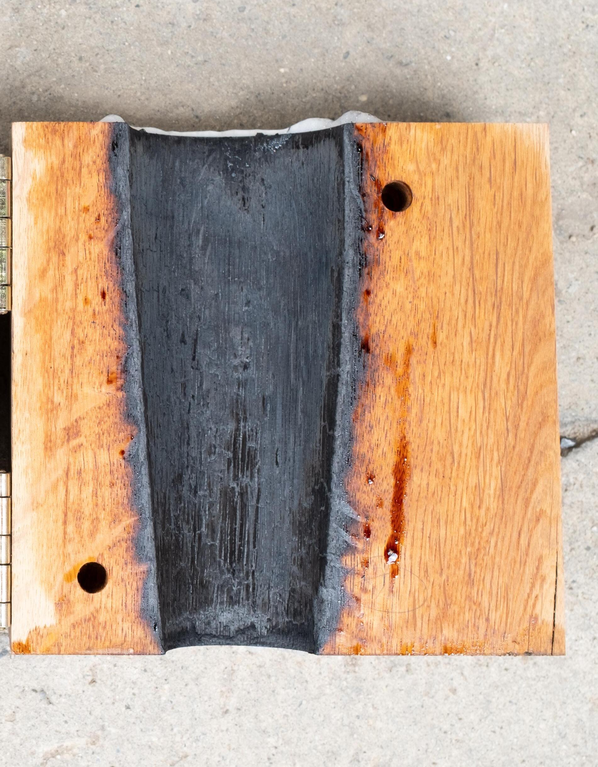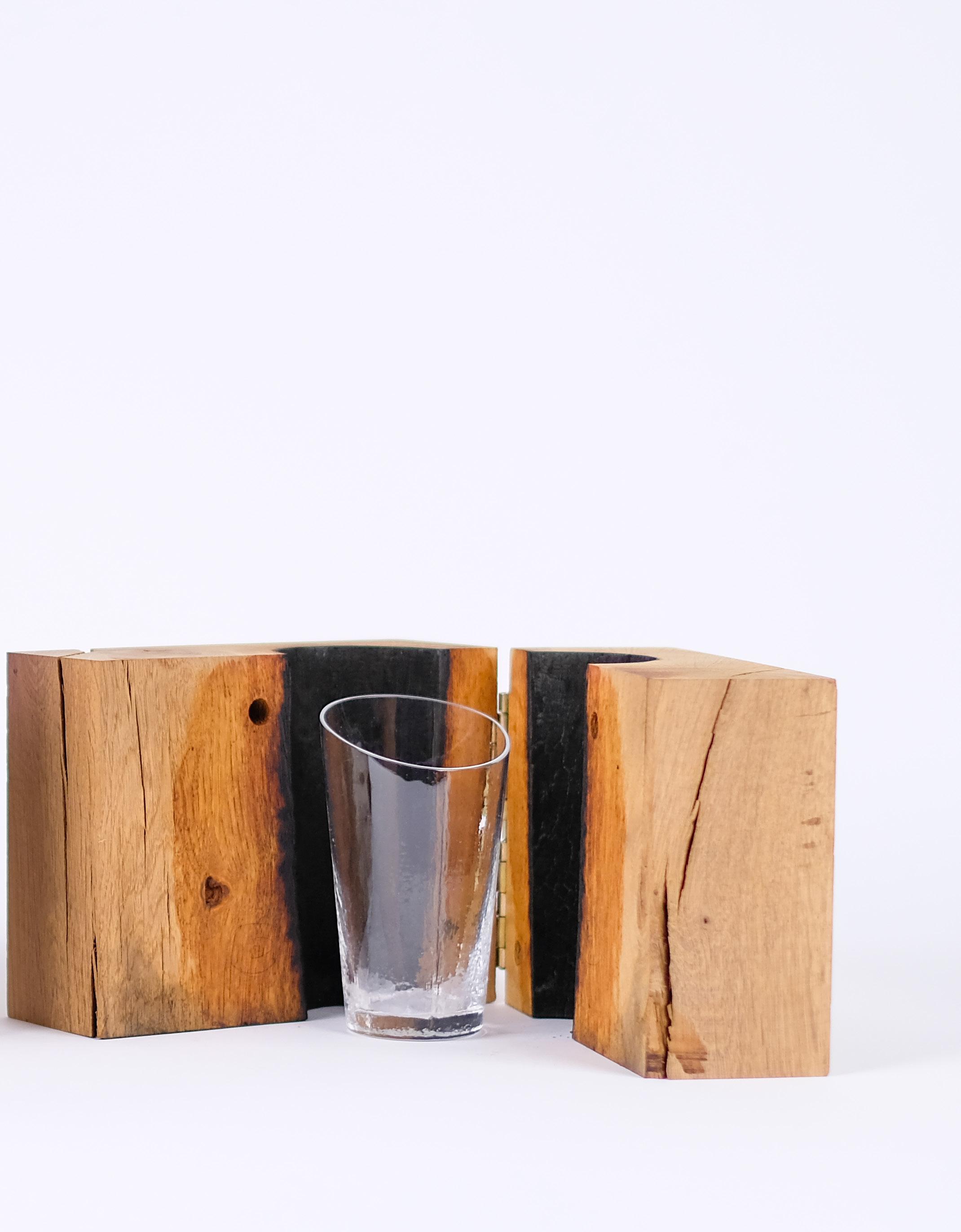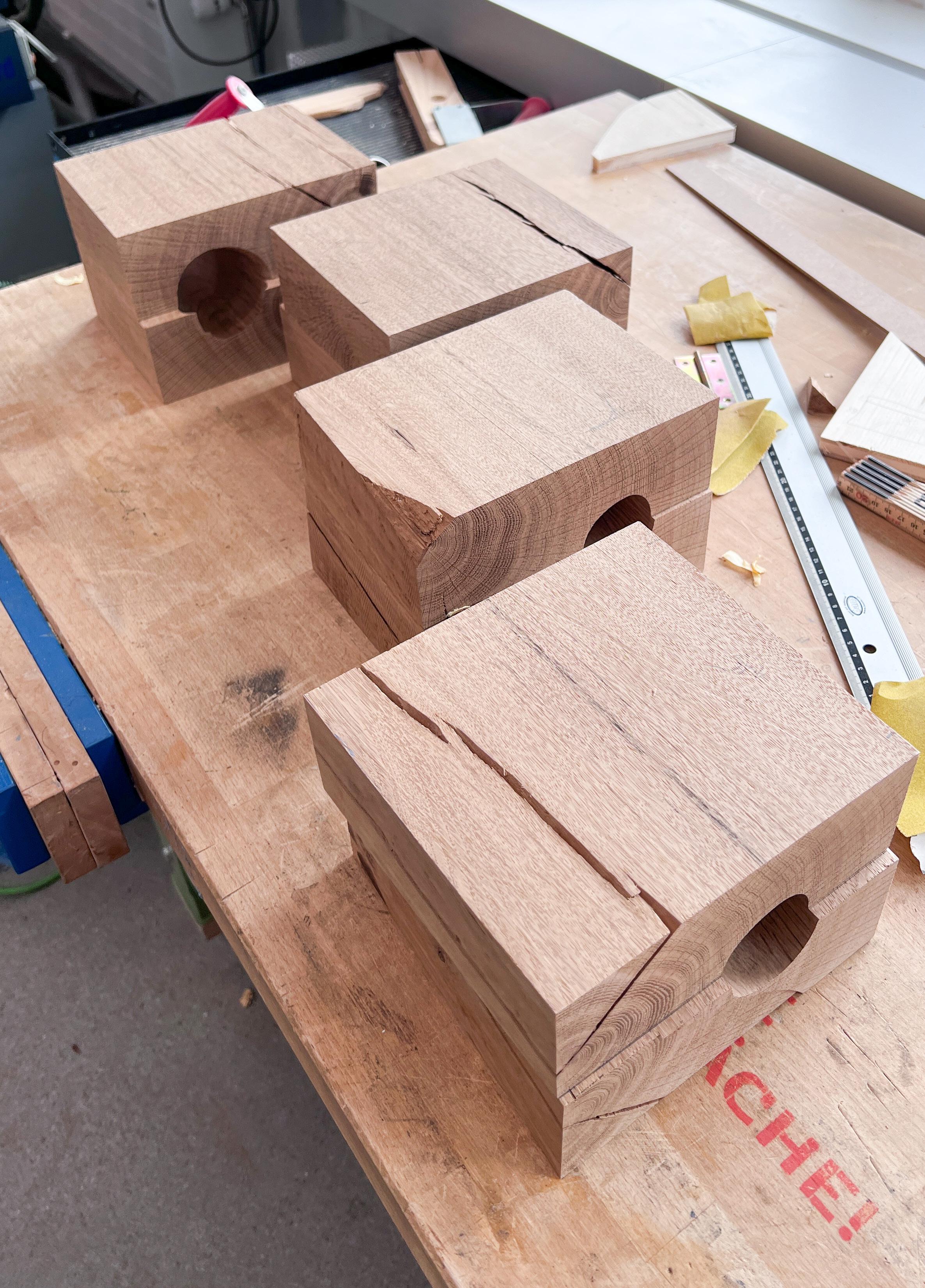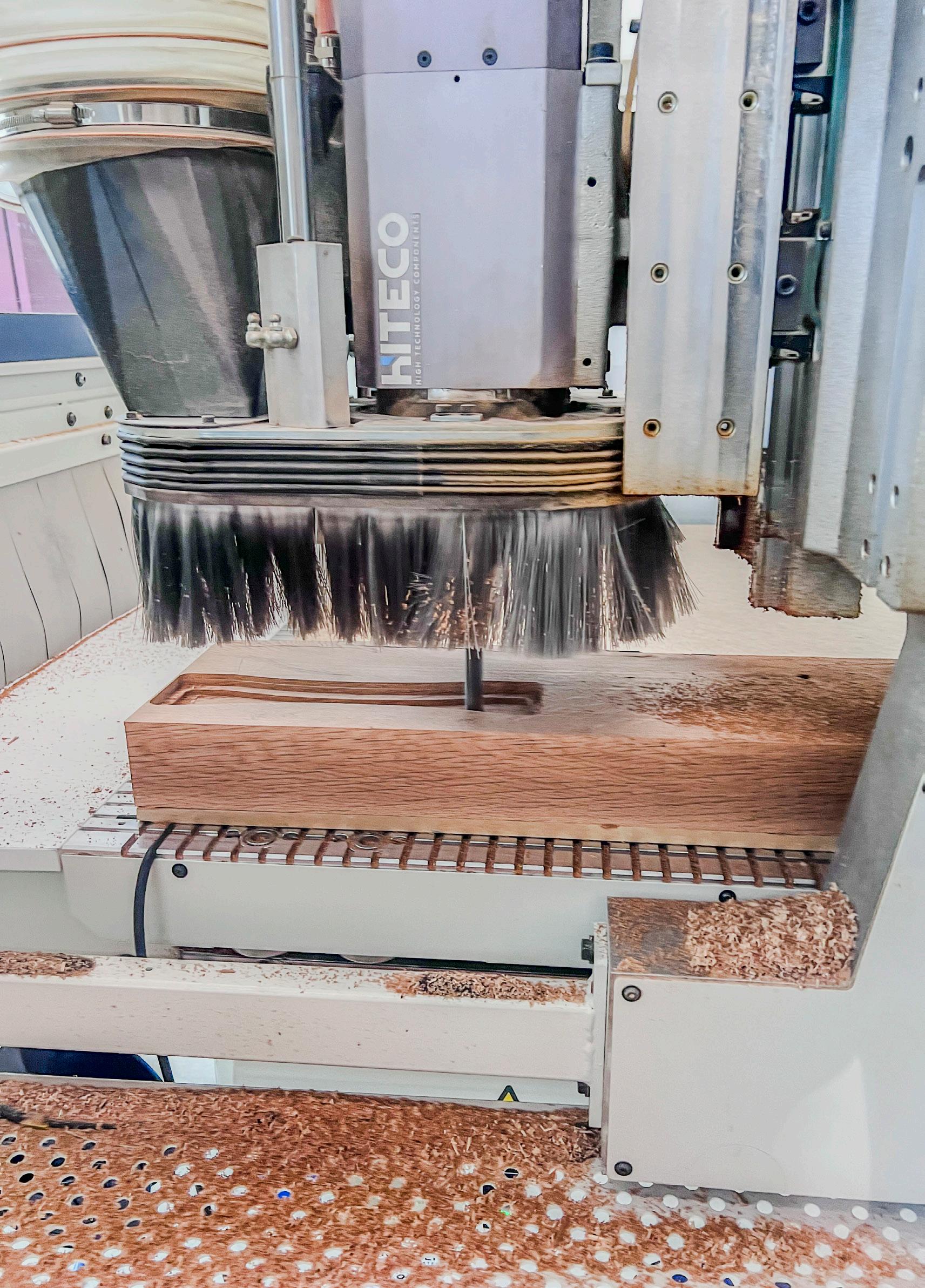 Formsprache in Glas realisieren zu können, habe ich als erstes ein Eichenholzbrett als Grundlage verwendet. Diese habe ich bearbeitet und auf der CNC die Negativformen eingefräst. Danach von Hand geschliffen und mithilfe von Dübeln miteinander verbunden, ausgerichtet und schliesslich die Scharniere montiert.