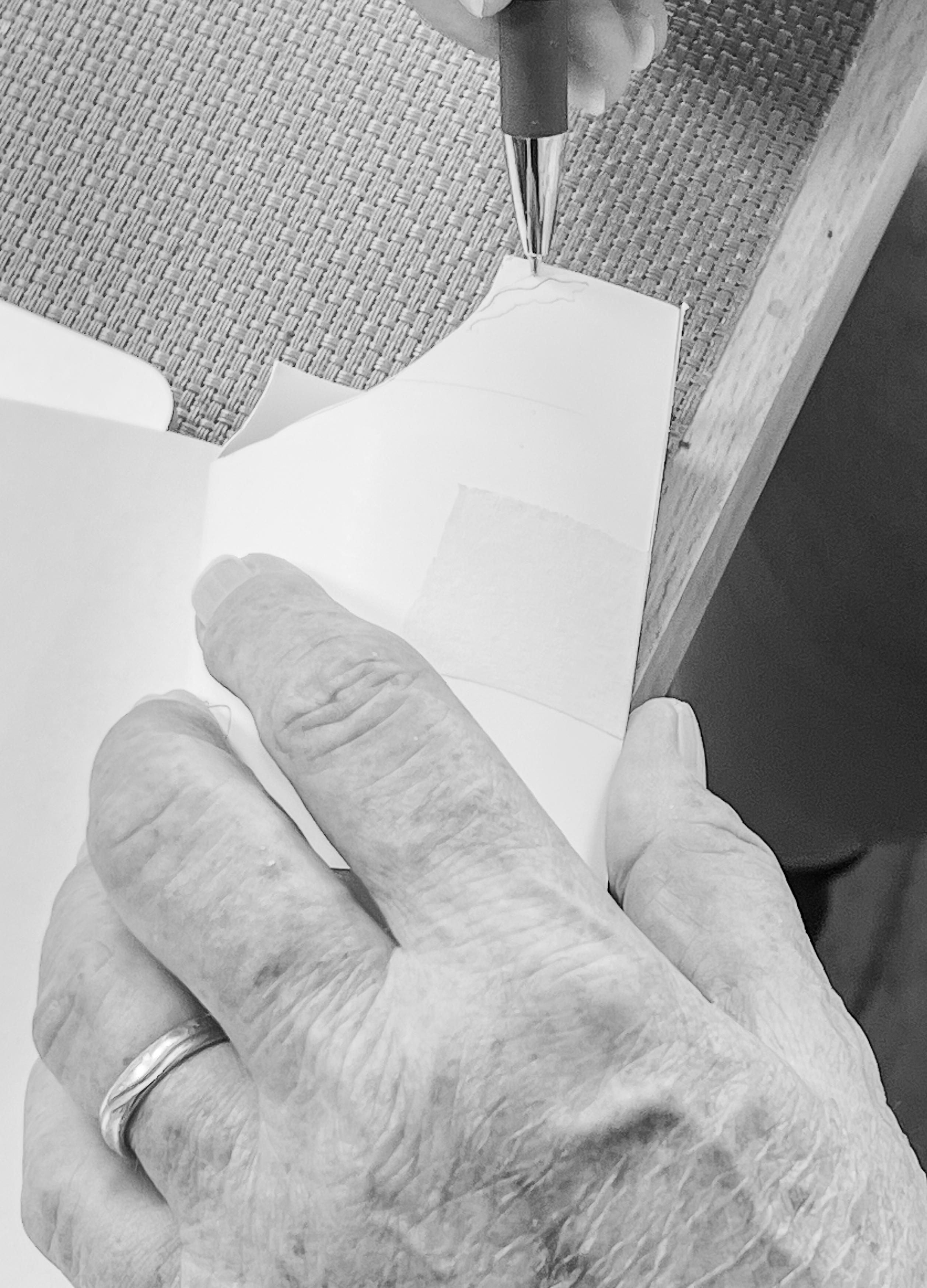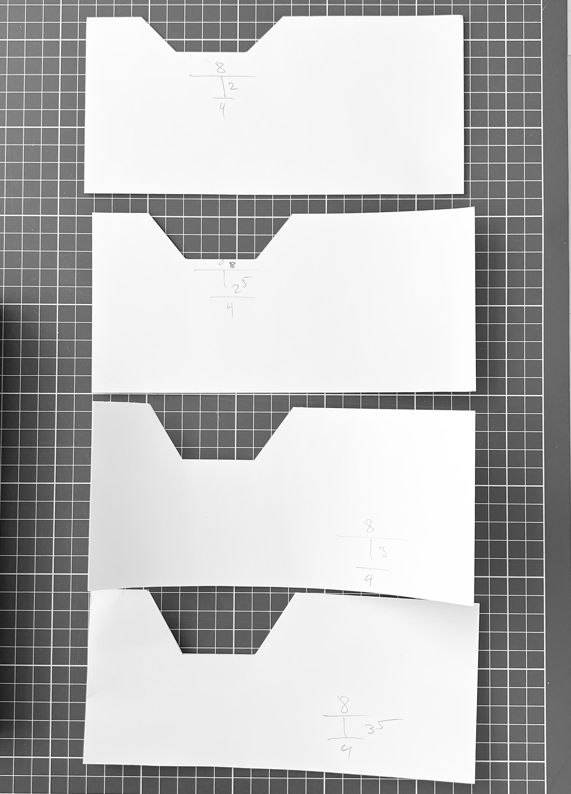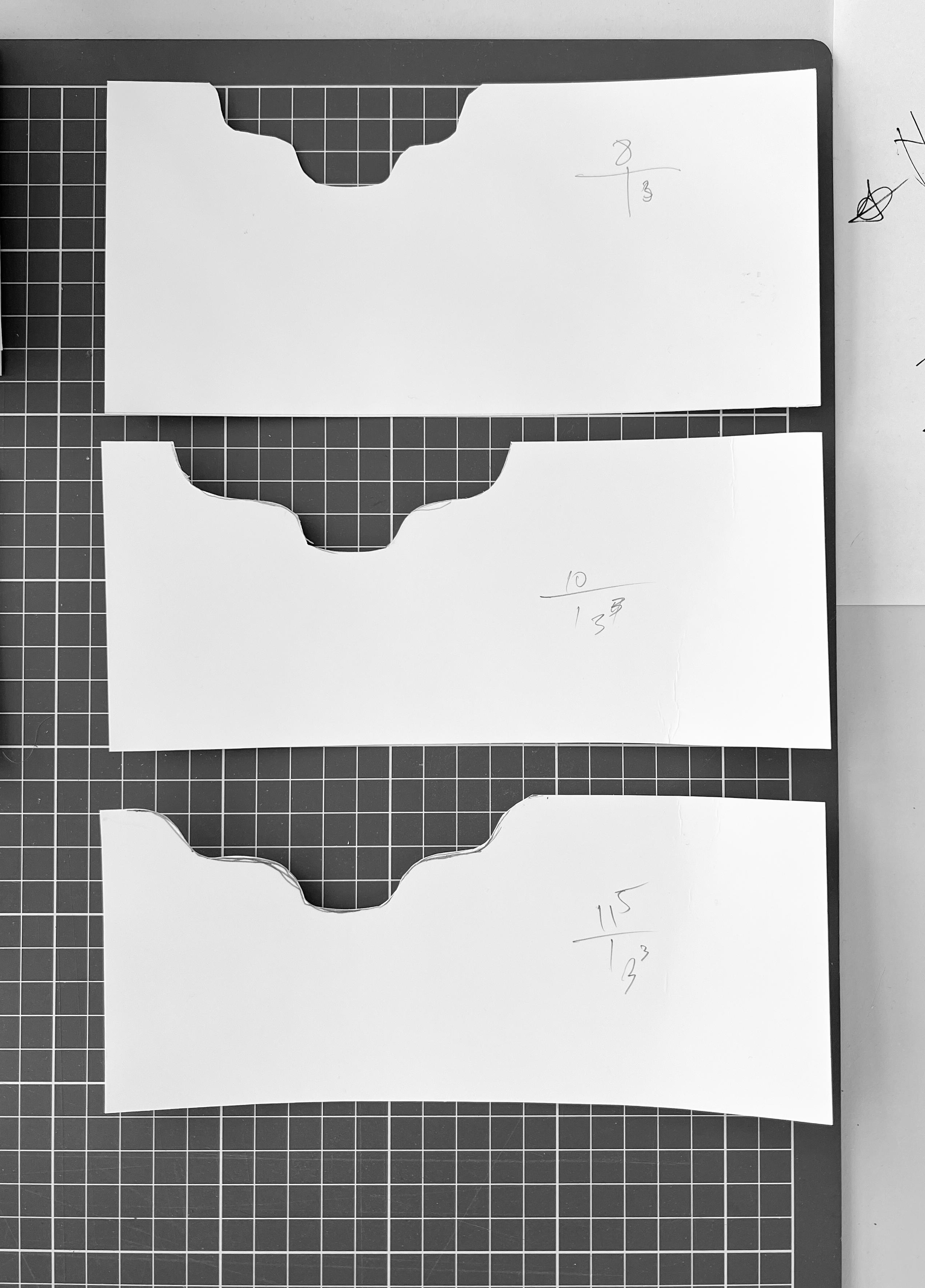 Um die Dimensionierungen dieses Nasenausschnittes zu de nieren, habe ich Papiermodelle mit verschiedenen Tiefen des Ausschnitts gewählt, um herauszu nden, unabhängig von der Form, wie viel Platz die Nase braucht.