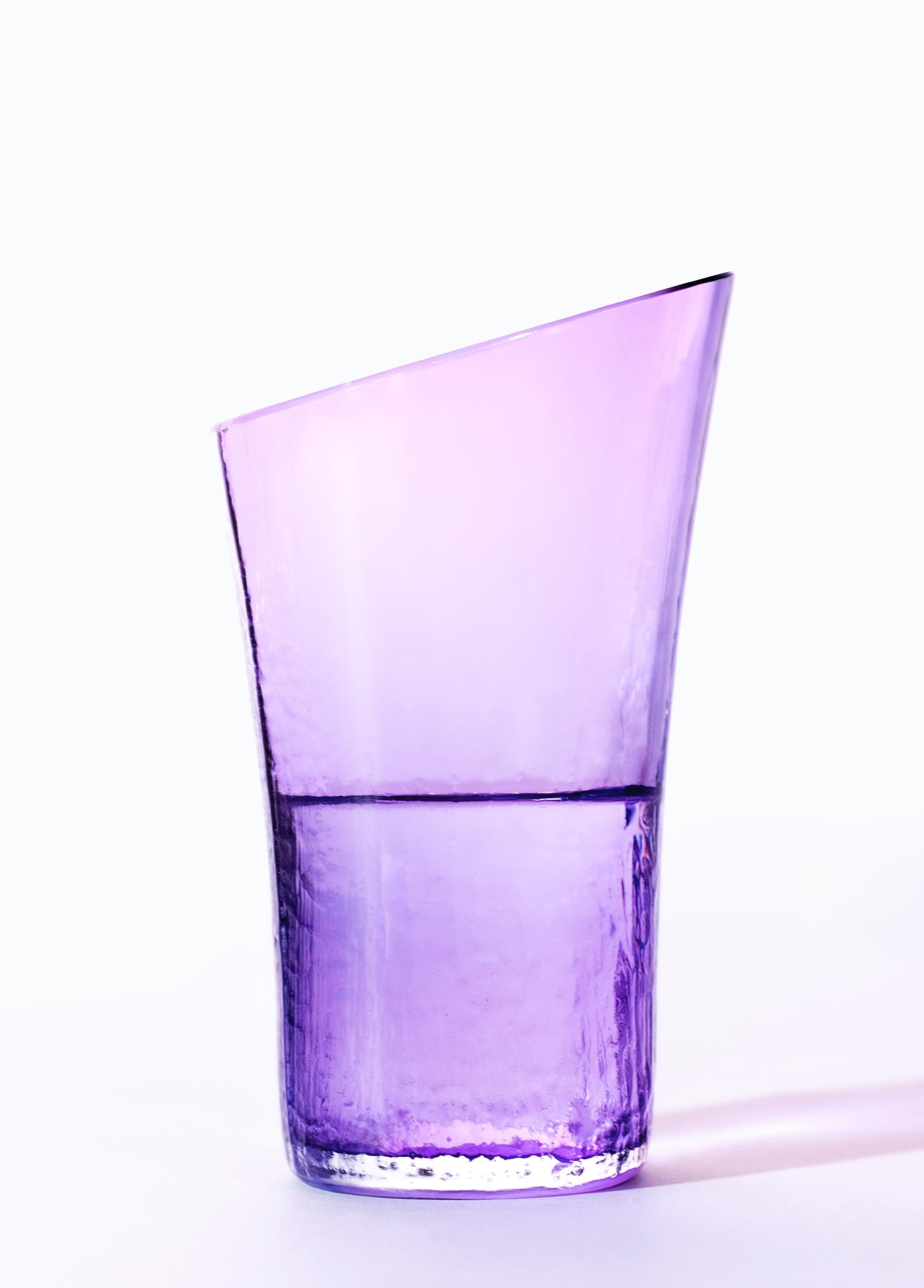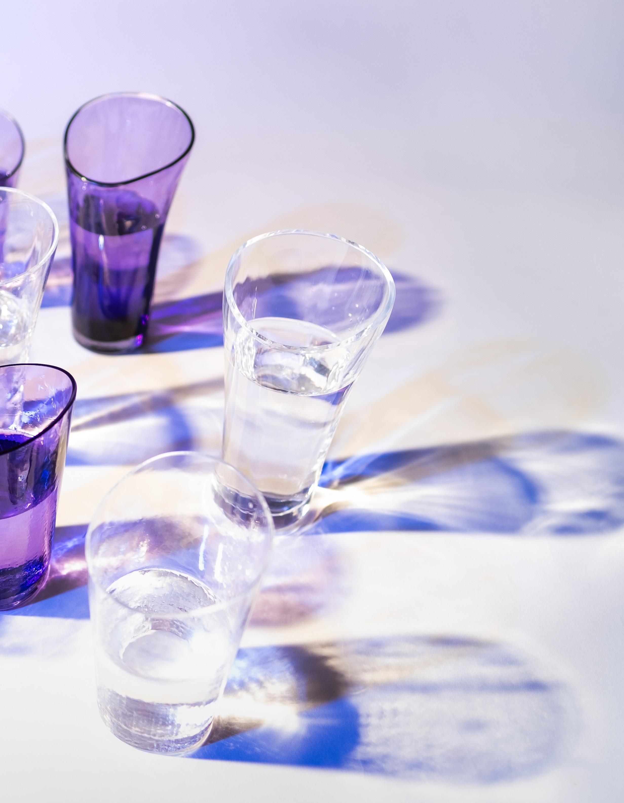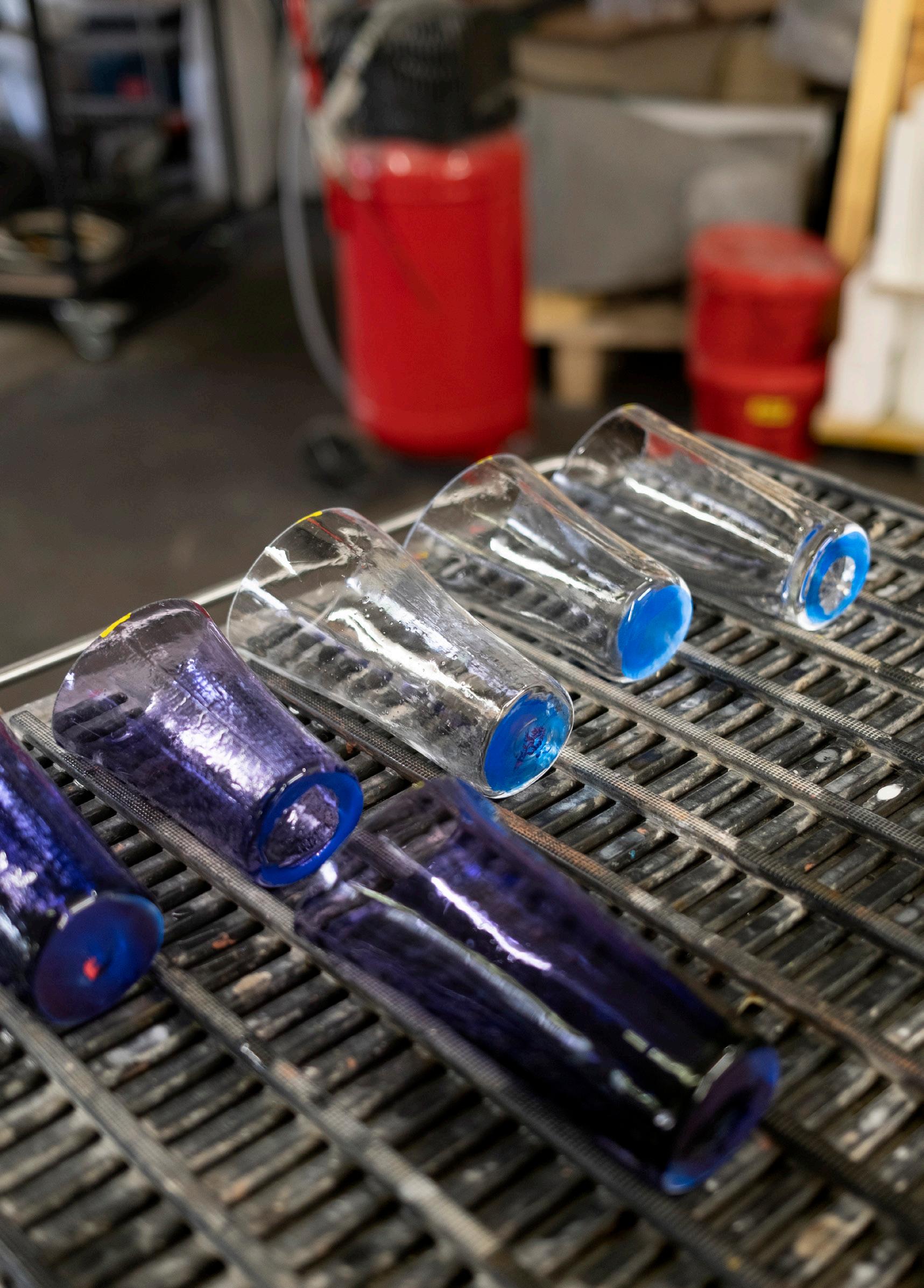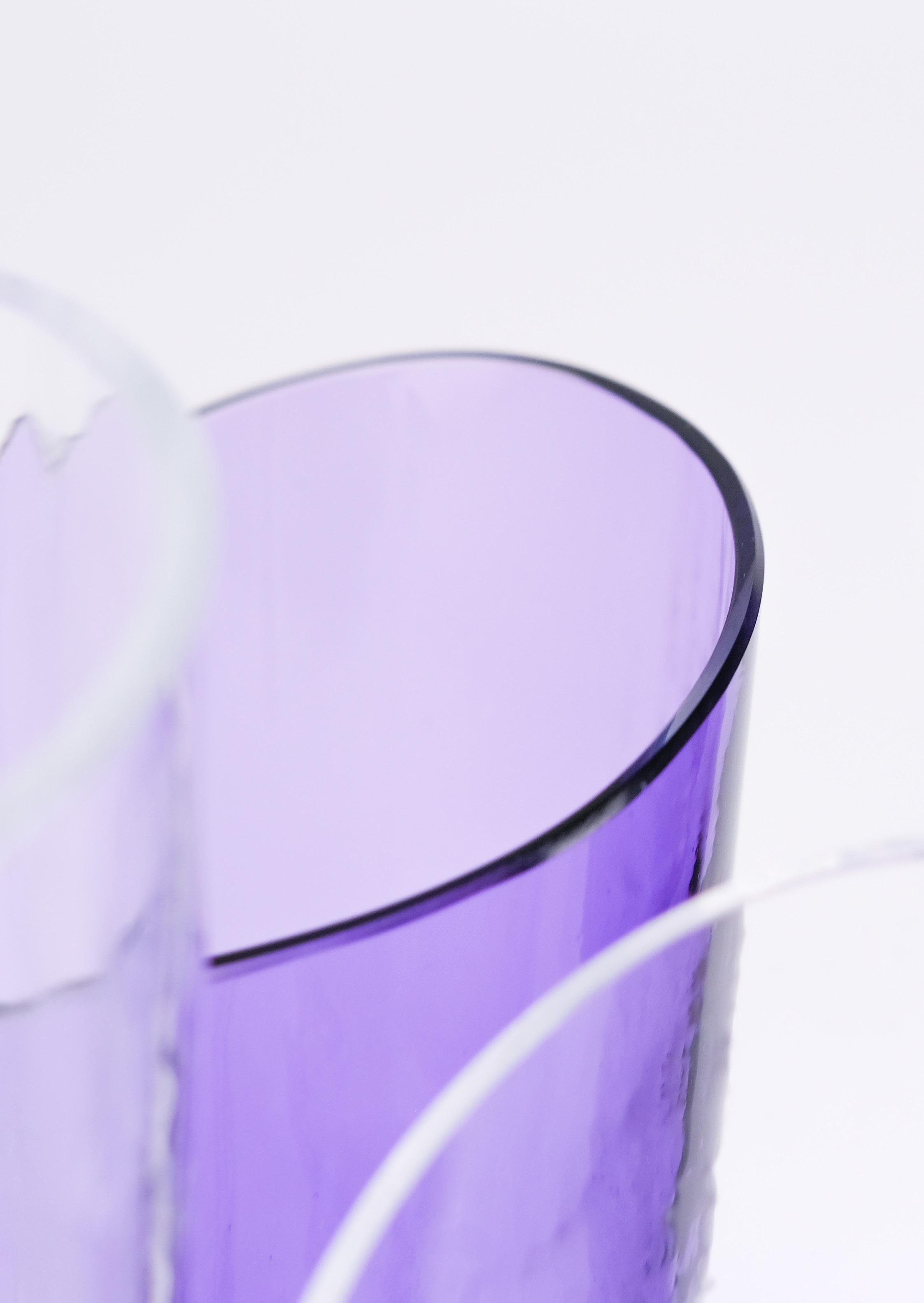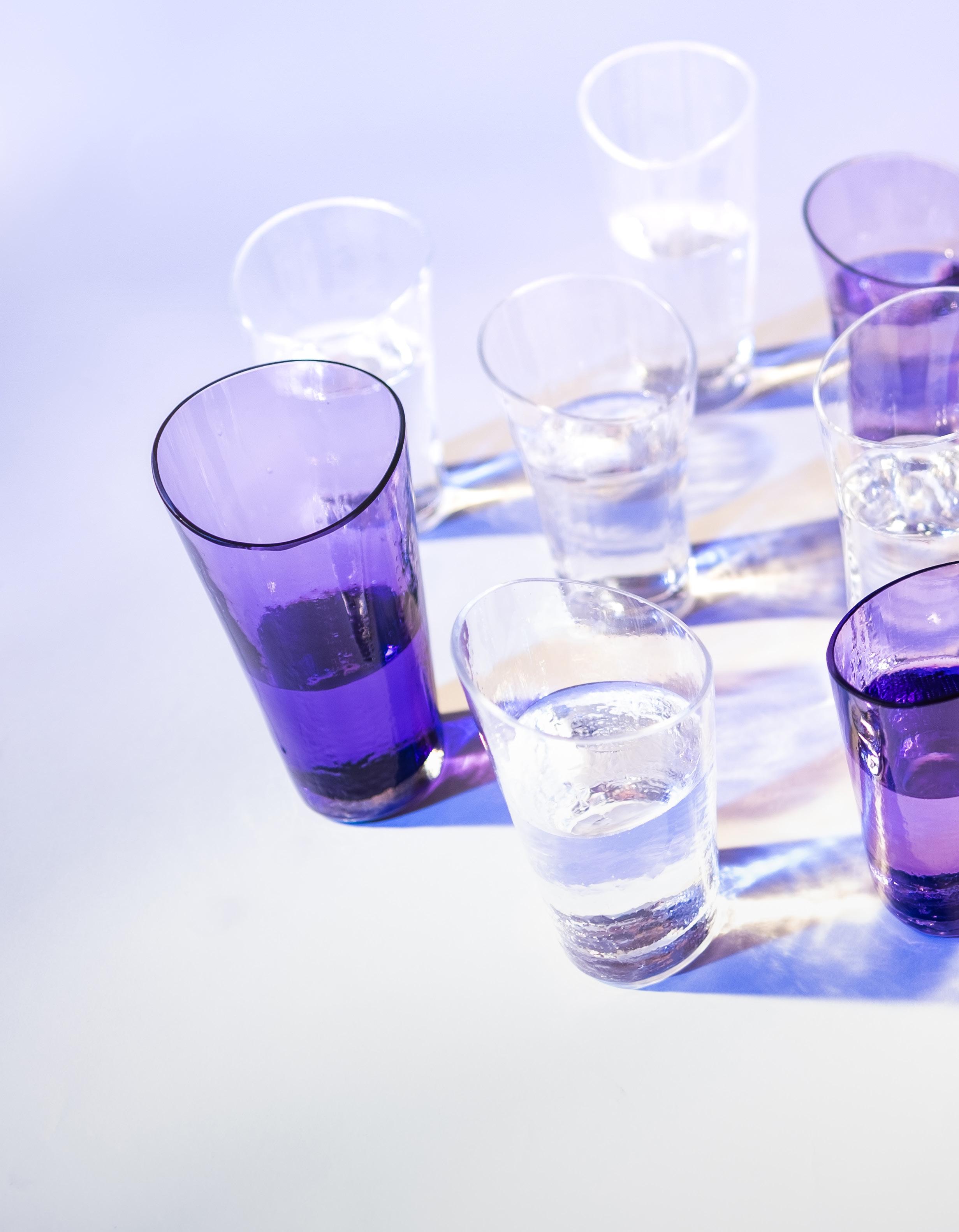 Aus der Produktion entstanden 12 Gläser. Es sind jeweils 2 durchsichtige und ein farbiges Glas einer Variante vorhanden. Das farbige ist in einem dunklen Violett gehalten, was eine gewisse Eleganz vermitteln soll und möglichst nicht mit einem Ikea Trinkbecher in knallgelb verwechselt werden soll.
