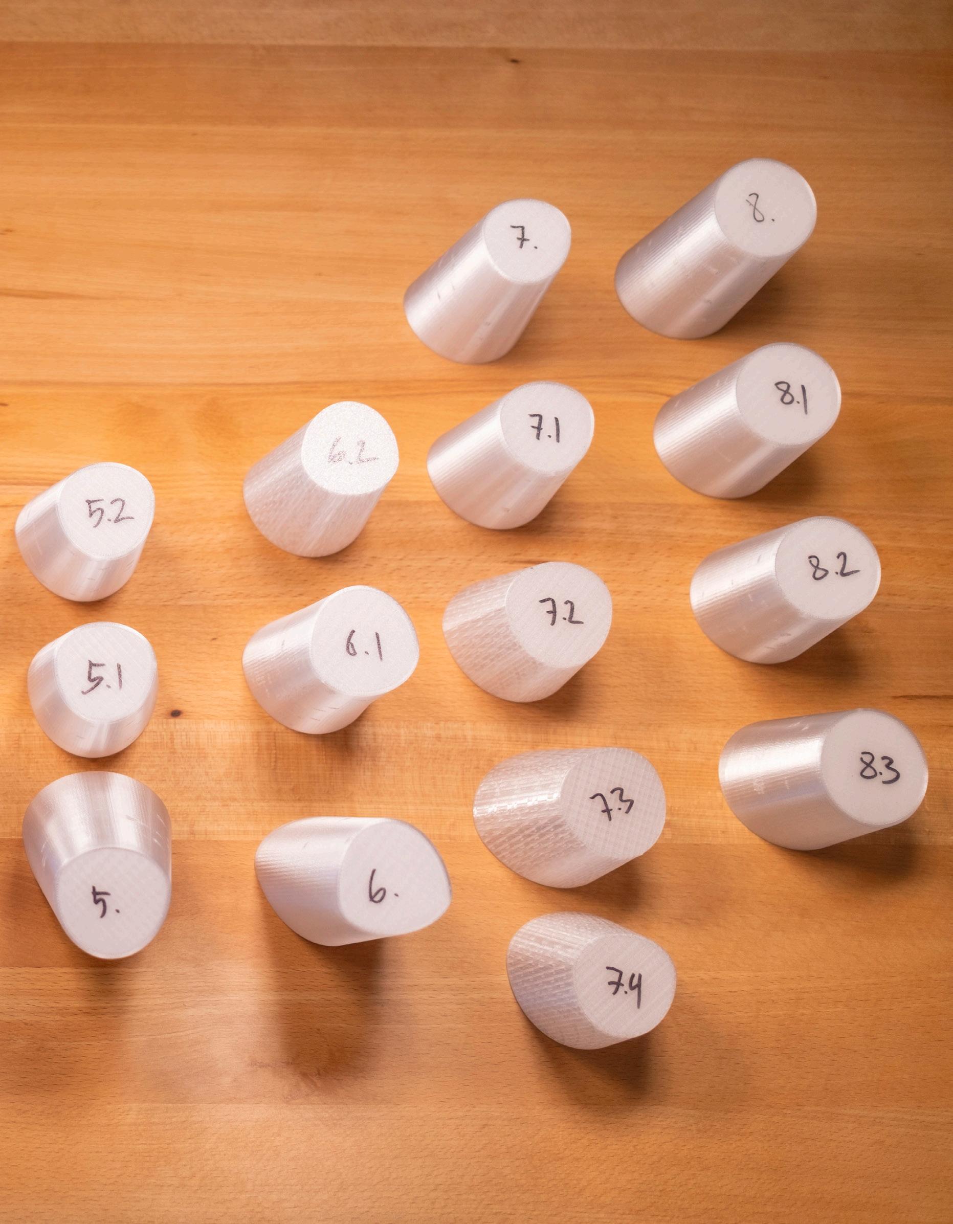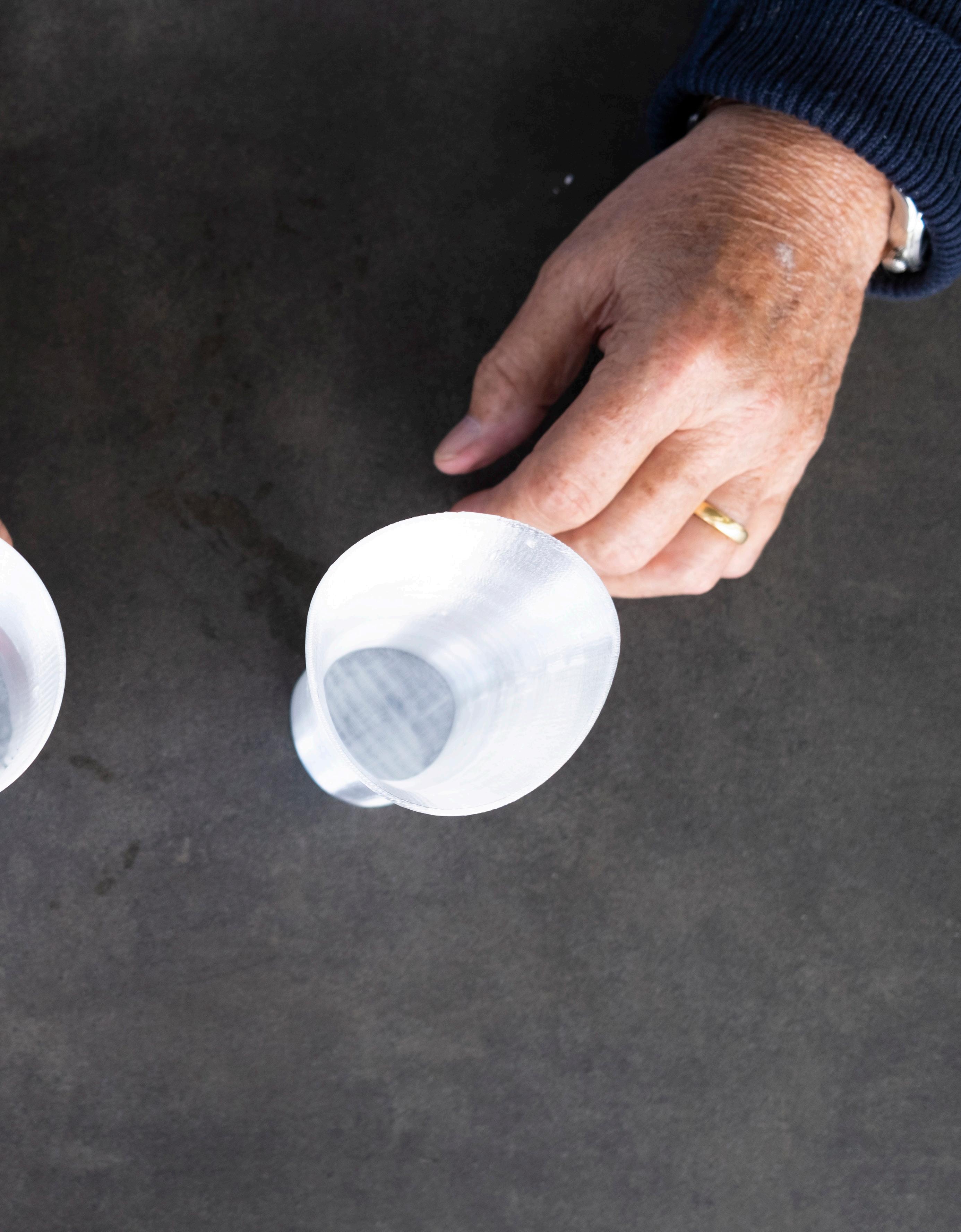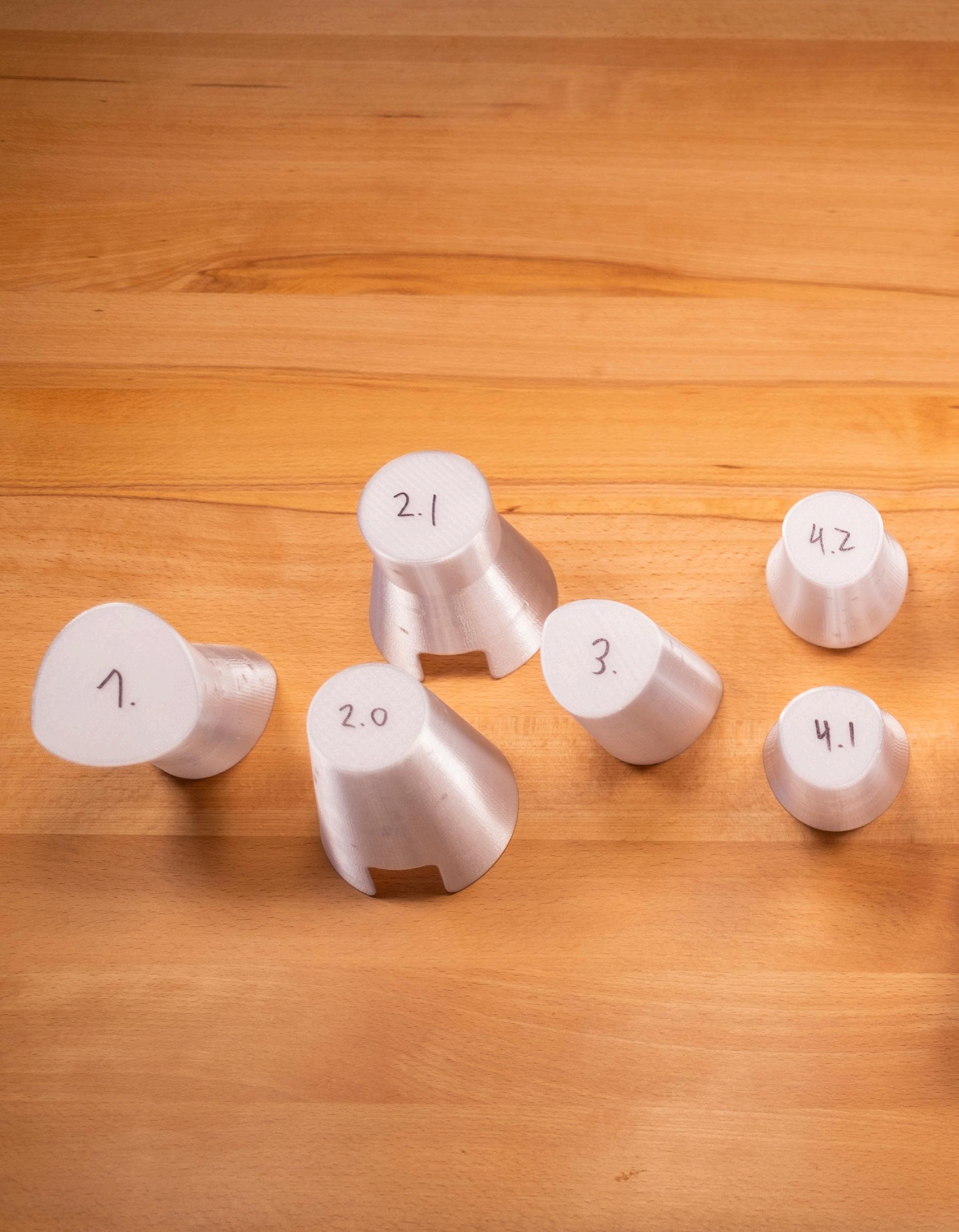 Die Tulpenform (Nr. 4) gefällt meinem Vater - ästhetisch durch die aussergewöhnlichere Form und praktisch durch den schmalen Durchmesser - sehr. Für den nächsten Test wird die Tulpenform durch eine kleine Variante ergänzt und optisch noch leicht entschärft (weniger "tulpig").