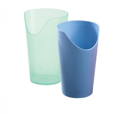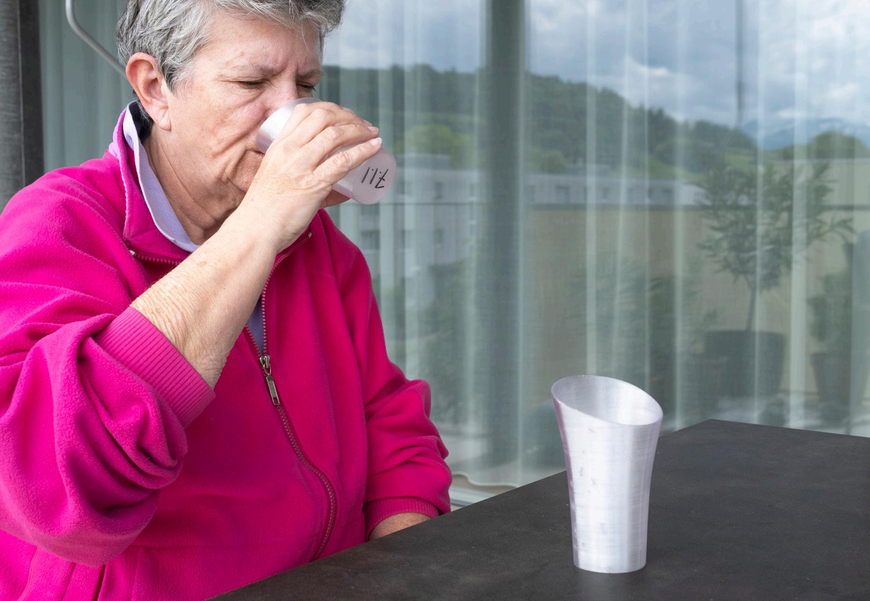 Um Schluckstörungen oder auch Bewegungseinschränkungen im Nackenbereich beim Trinken zu minimieren, ist es notwendig, Platz für die Nase zu schaffen. Denn durch diesen Platz für die Nase kann aus dem Trinkglas getrunken werden, ohne den Kopf in den Nacken zu legen. Dies ist insofern von grosser Relevanz, da die Kopfposition bei der Behandlung von Schluckstörungen zentral ist. Wichtig ist, dass der/die Betroffene den Kopf möglichst gerade oder besser, den Kopf leicht nach unten, Richtung Brust legt. Dies vereinfacht den Schluckvorgang, denn es kann kontrolliert werden, dass nicht zu viel und zu schnell Flüssigkeit in den Rachen gelangt. Zudem schützt diese Kopfhaltung die Luftröhre.