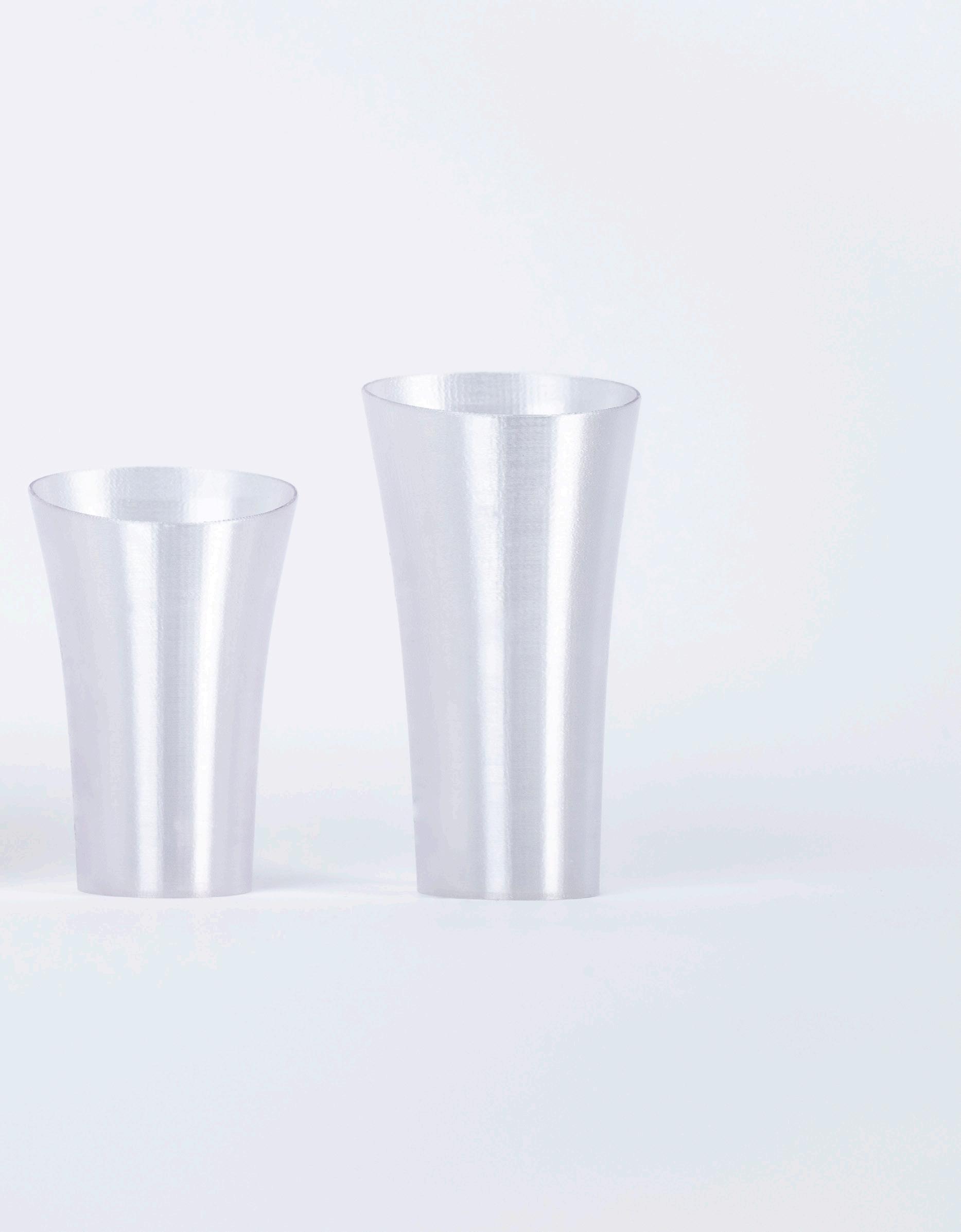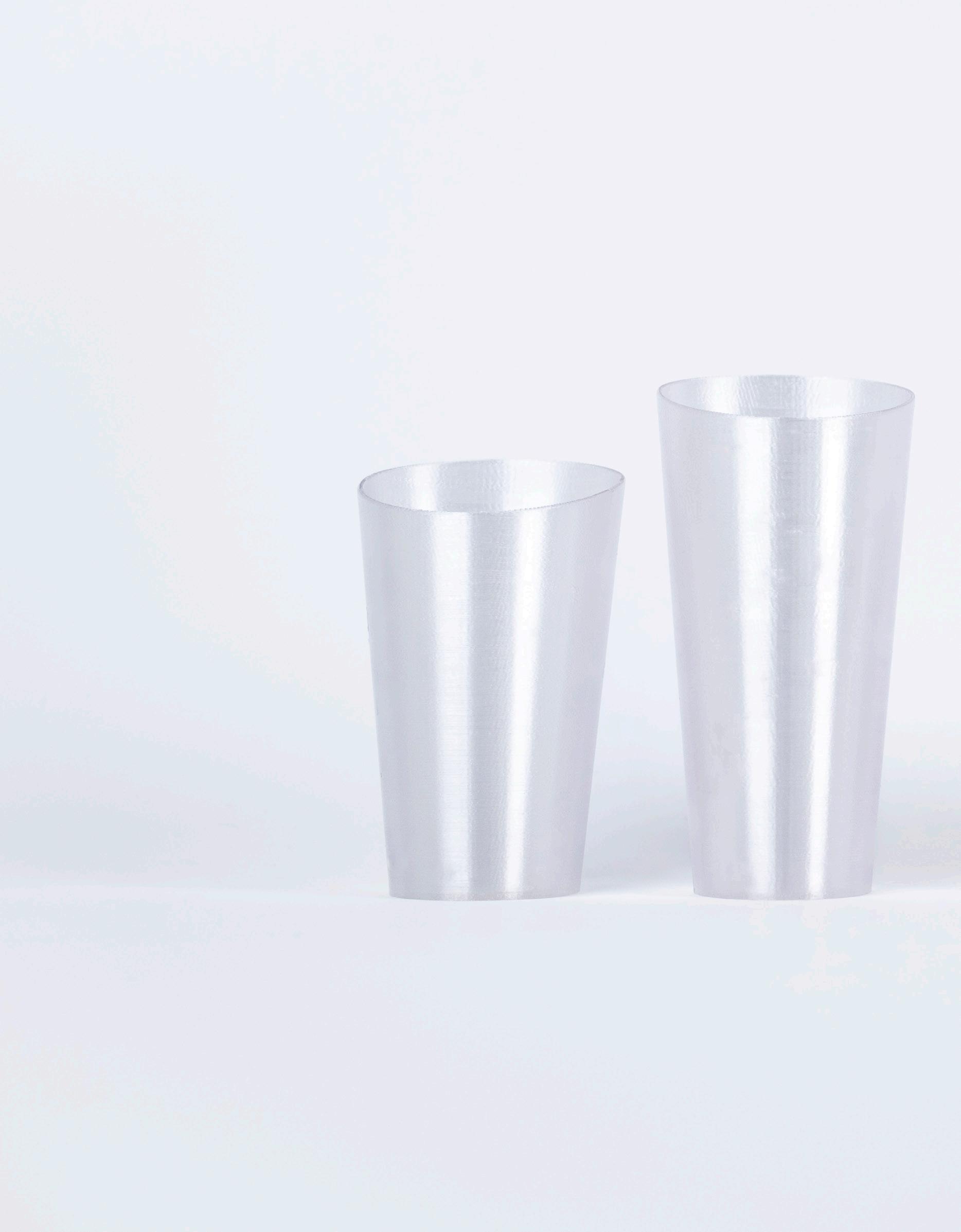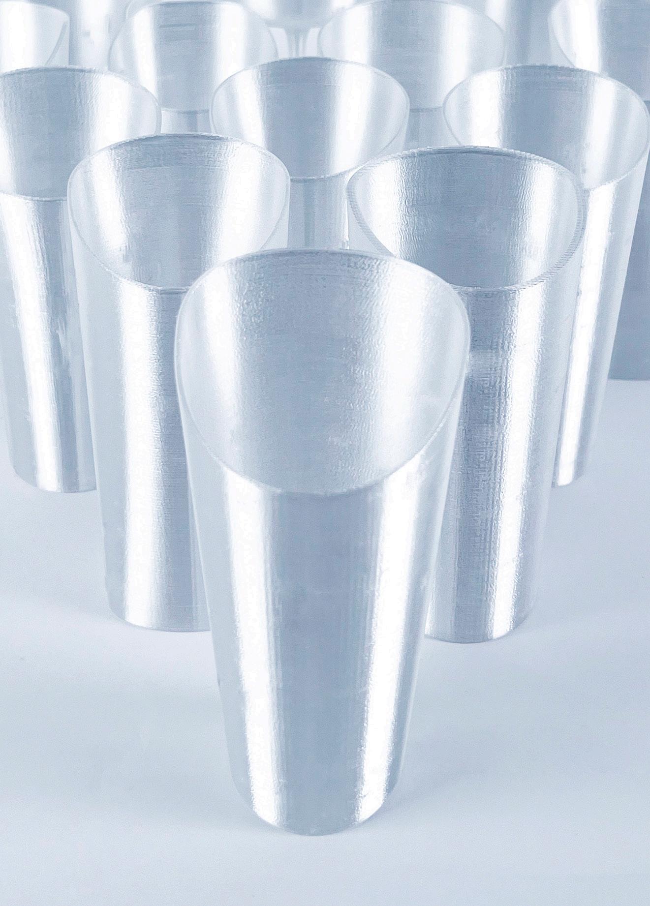 Die nächsten Seiten zeigen die ersten Prototypen und Tests. Die Prototypen habe ich mithilfe des CAD-Rhino erstellt und mit einem 3D-Drucker hergestellt. Das verwendete Filament ist aus PET-Clear und soll durch seine Farbe möglichst neutral und eine Annäherung an das Material Glas sein.