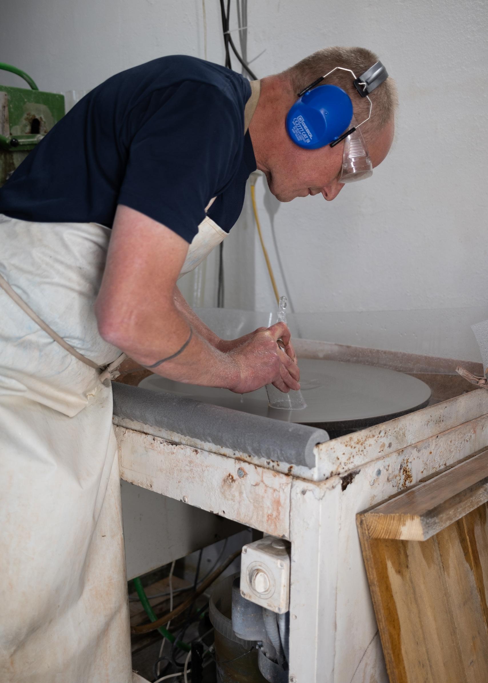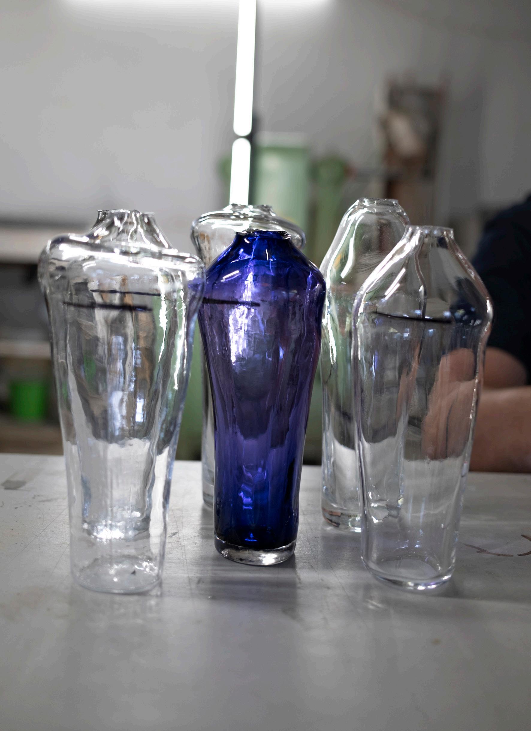 Um möglichst meiner Formsprache nahe zu kommen und nur ein leichter Radius, welcher auch gewünscht ist, zu erzielen, sind die Formen unten jeweils offen. Grund sind die Produktionsparameter der CNC und das Material Glas selbst.