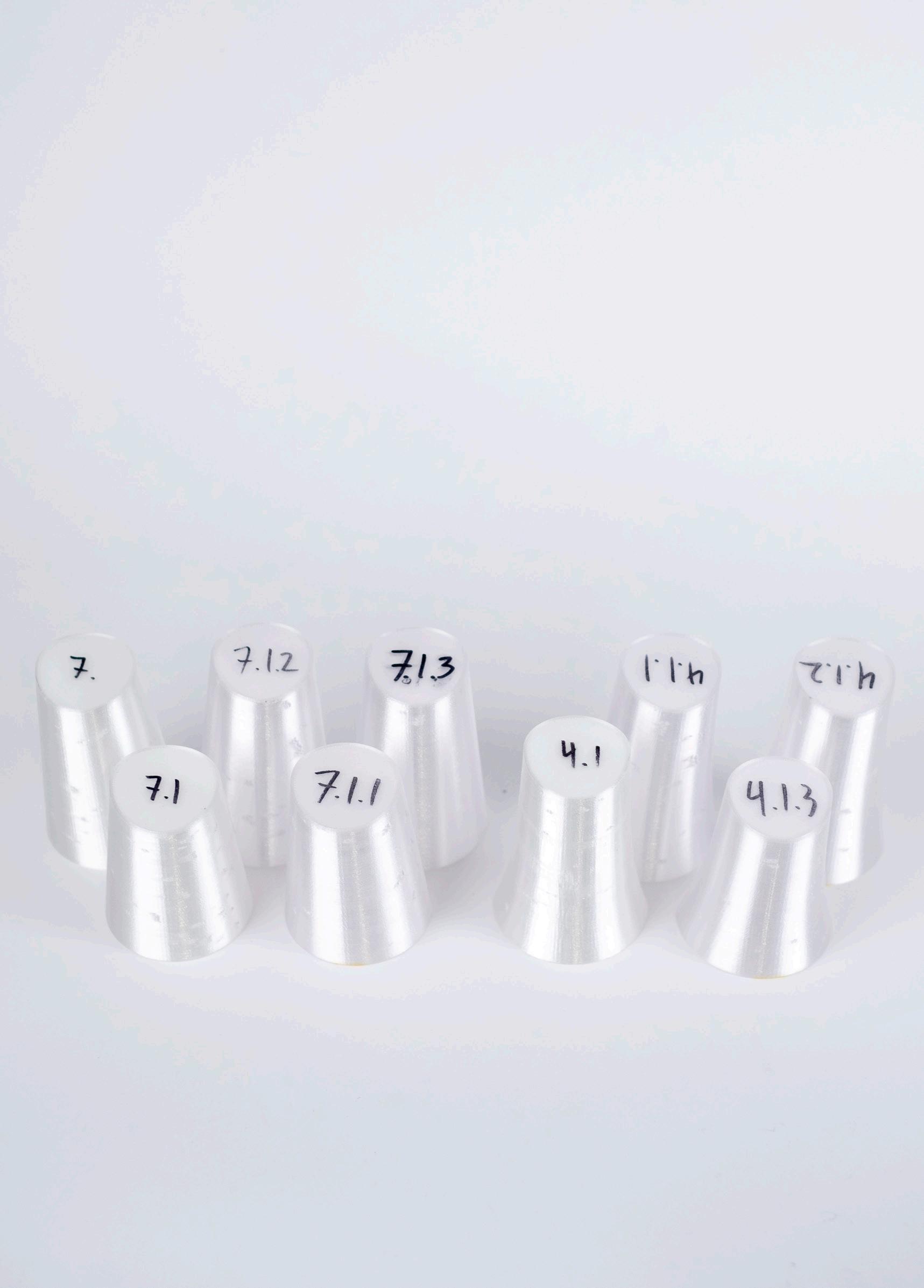 Anhand des ersten Tests konnte herauskristallisiert werden, dass diverse Varianten bis auf 3 weder ästhetisch noch praktisch (Greifen) für die Weiterbearbeitung geeignet sind. Die Varianten mit der Grundform eines Plektrums Nr. 4 und 7 und ebenfalls die runde Form Nr. 8 sind für die Trinktests geeignet. Sie zeichnen sich jeweils durch eine gewisse Einfachheit, Konformität in der Formsprache aus, was den inklusiven Faktor dieser Arbeit untermauert. Sie haben weder ein Knick in der Mitte noch einen sichtbaren Nasenausschnitt. Nr. 7 und Nr. 8 sind jeweils schon in 3 Grössen für den Test vorhanden gewesen. Nr. 4 nur in der grossen Form.