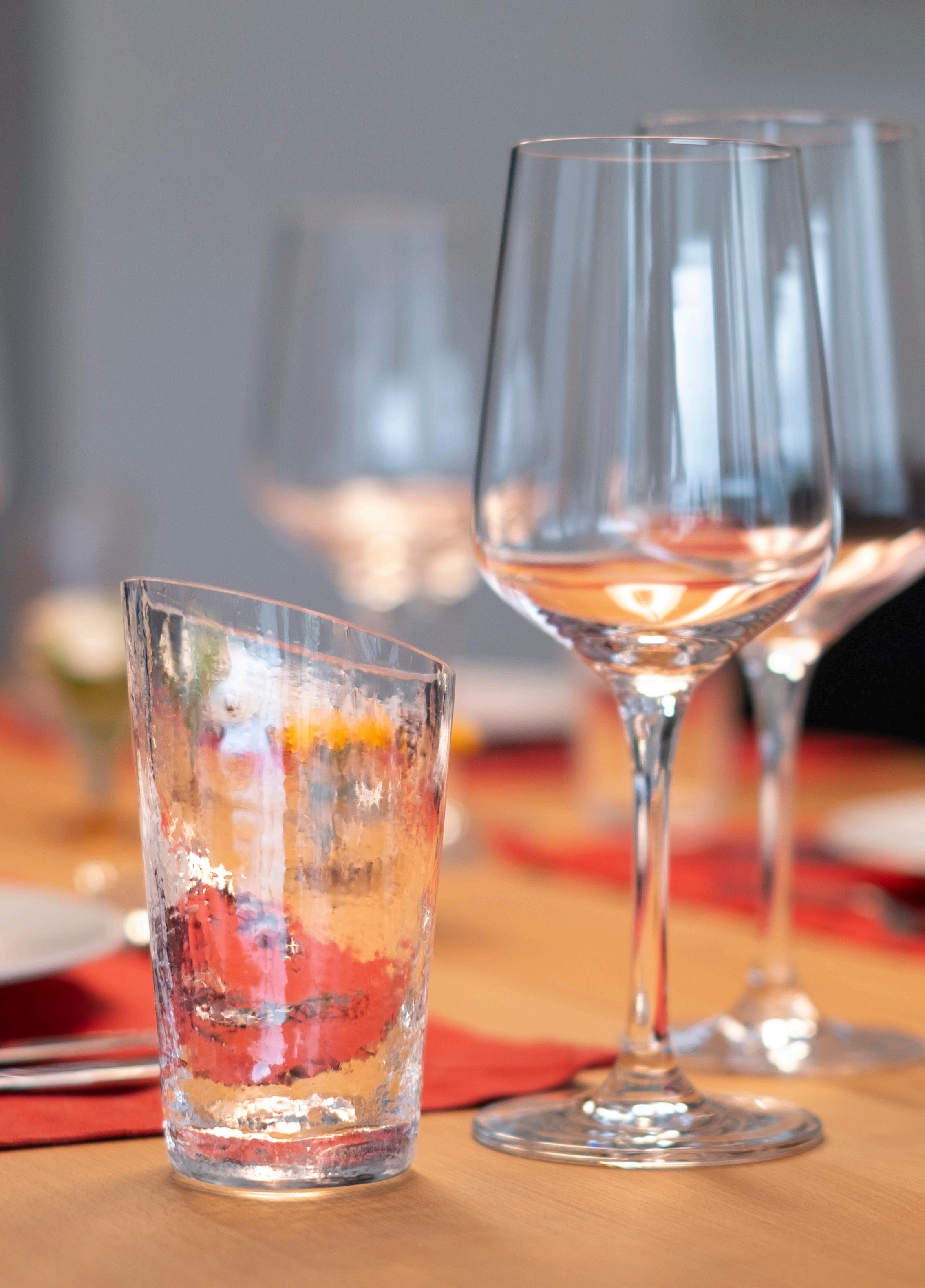 Bei der Produktion habe ich Wert daraufgelegt, dass die Gläser verschiedene Wanddicken und Bodendicken verfügen, um dies bei den Rückmeldungen mit meinem Vater zu besprechen. Die texturierte Ober"äche untermauert die handwerkliche Arbeit und stört weder optisch noch haptisch.