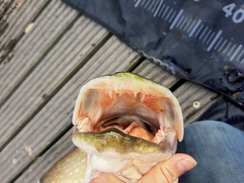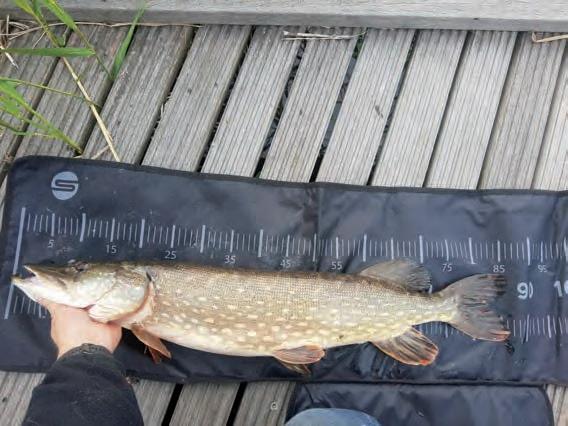 We pakken onze hengelfoedraal uit en tuigen de roofvishengels op. Elk met gevlochten lijn en zelfgemaakte uoro arbon onderli nen k speld een atterbait eig ted ig op en asper i n fa oriet de estin i k e oa an m met een aak op een 7 grams jighead. e ruimen de o erige spullen op en gaan sluipend ri ting de begroeide sloot es anaf een brugget e kunnen we naar het einde van het slootje in de splitsing gooien asper sluit i n beugel en draait binnen og geen al e meter eeft de i k door de sloot ge wommen of er komt een boeggolf achteraan vanuit het riet. Een snoek die lekker lag te chillen kan de shad niet weerstaan en hapt toe. De klap is enorm en et kost asper enige moeite om de is de baas te bli en maar dit lukt asper staat te springen an bli ds ap wanneer ik de is eb weten te landen. e snoek is groot en kra tig de aak it net es in de eendenbek en komt goed los. Tijdens de kieuwgreep snijden een paar van die 700 tanden in mijn knokkels maar bi o n is is dat niet o erg e e snoek meet m op de ont aakmat en aspers oude re ord an de winter stond op m dus de e is een stuk groter en betekent een persoonlijk record. Even een paar mooie foto s en oals asper ei e Koning van de Sloot mag weer terug!” Die avond vangen we verder niets meer maar waren allebei erg bli met de e koning van de sloot.