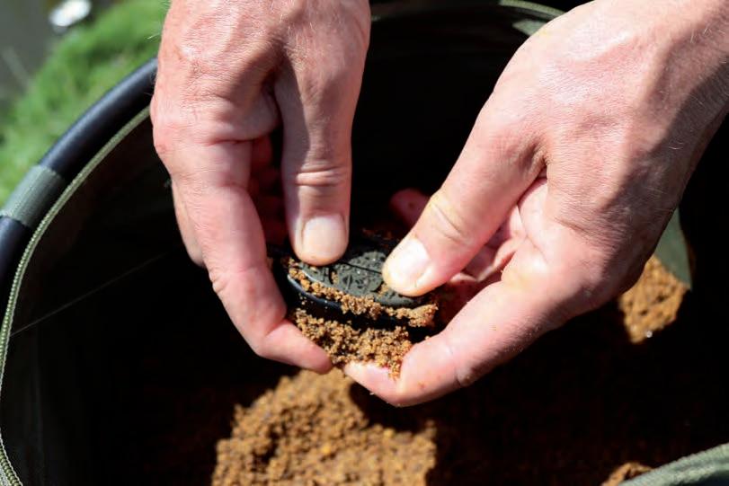 vijver. Voor Arnout is dit een perfect watertje om er even een paar uurtjes een hengeltje uit te gooien. e i er is et best te bereiken per fiets of te voet. Je kunt er ook in de buurt komen met de auto, maar dan is het nog wel een 300 meter lopen naar het water. De vijver in het park is een meter of 200 lang en zo’n 70 meter breed. Het visbestand bestaat voornamelijk uit bliek, voorn, brasem, zeelt en ook een ink wat karpers iteraard wemt er ook een leuke hoeveelheid roofvis in rond. Voor het water geldt een algeheel meeneemverbod en je dient dus alle vis die je vangt meteen weer terug te zetten. Laat je leefnet dus maar thuis. Bij dit soort stadsvisserij heb je niet veel materiaal nodig en dat is maar goed ook. Als je lopend naar je stek gaat is het zaak om zo weinig mogelijk mee te nemen. Arnout heeft een foedraaltje met twee feedertjes, een schepnet met steel, een visstoeltje en een tasje met klein materiaal meegenomen. De paar honderd meter lopen naar de vijver is op deze manier goed te doen. Zoek bij dit soort vijvers een stek waar je aan de overkant wat natuurlijk beschutting ziet zoals een eilandje met overhangende bomen of een zijsloot die op de vijver uitkomt. Arnout zoekt een stek recht tegenover een eilandje uit. Gevist gaat er worden op een meter of veertig, bijna tegen het eiland aan. Een soepele feederhengel van een meter of drie is voldoende, een 3000-molen met 6/00 gevlochten lijn, een Inline Banjo Feederkorf en een onderlijn van 18/00 nylon met een baitbandje is de uitrusting waar hij mee aan de slag gaat. De methodfeeder wordt half ge uld met mm anoffee o olat Orange Method Pellets. Daarna gaat de beaasde haak met een wafter (zwevende kleine boilie) aan een baitbandje op de eerste laag pellets, een beetje ‘Haze’ li uid erbi oor et wolkende effe t en dan nog een laagje 2 mm pellets zodat je de wafter niet meer ziet. Aandrukken in de bijpassende Mould en je methodfeeder is klaar voor gebruik. Kind kan de was doen. Ingooien, lijn onder water trekken, de hengel afsteunen en dan kun je met je handen over elkaar gaan zitten op je stoel. Meer hoef je niet te doen. Vissen