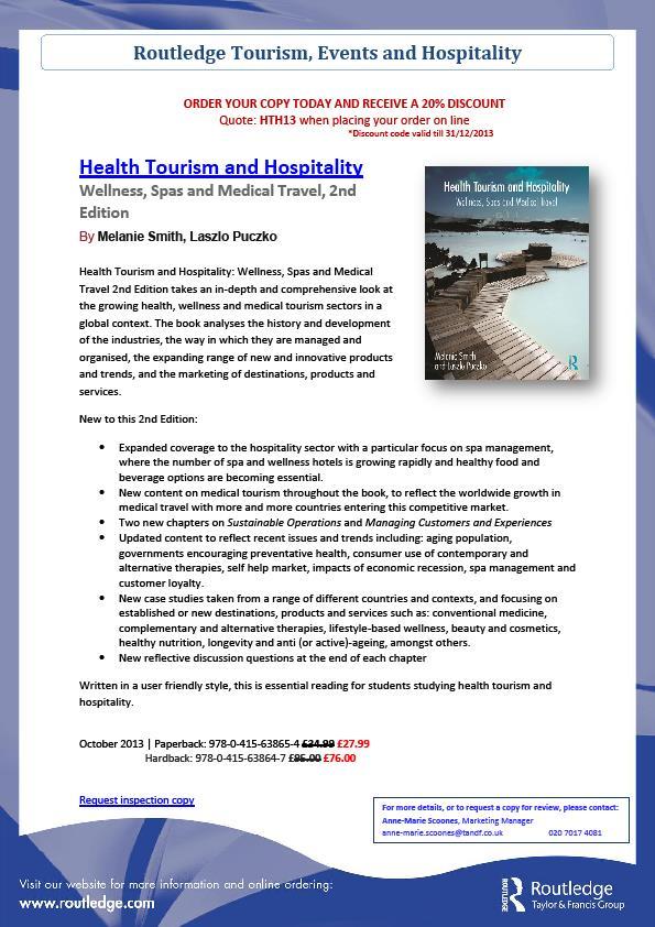 Should you wish to learn more about where and how the world of health tourism is going look for the second and revised edition of our book titled: Health, Tourism and Hospitality. Wellness, Spas and Medical Travel (published by Routledge, in Q4 2013).