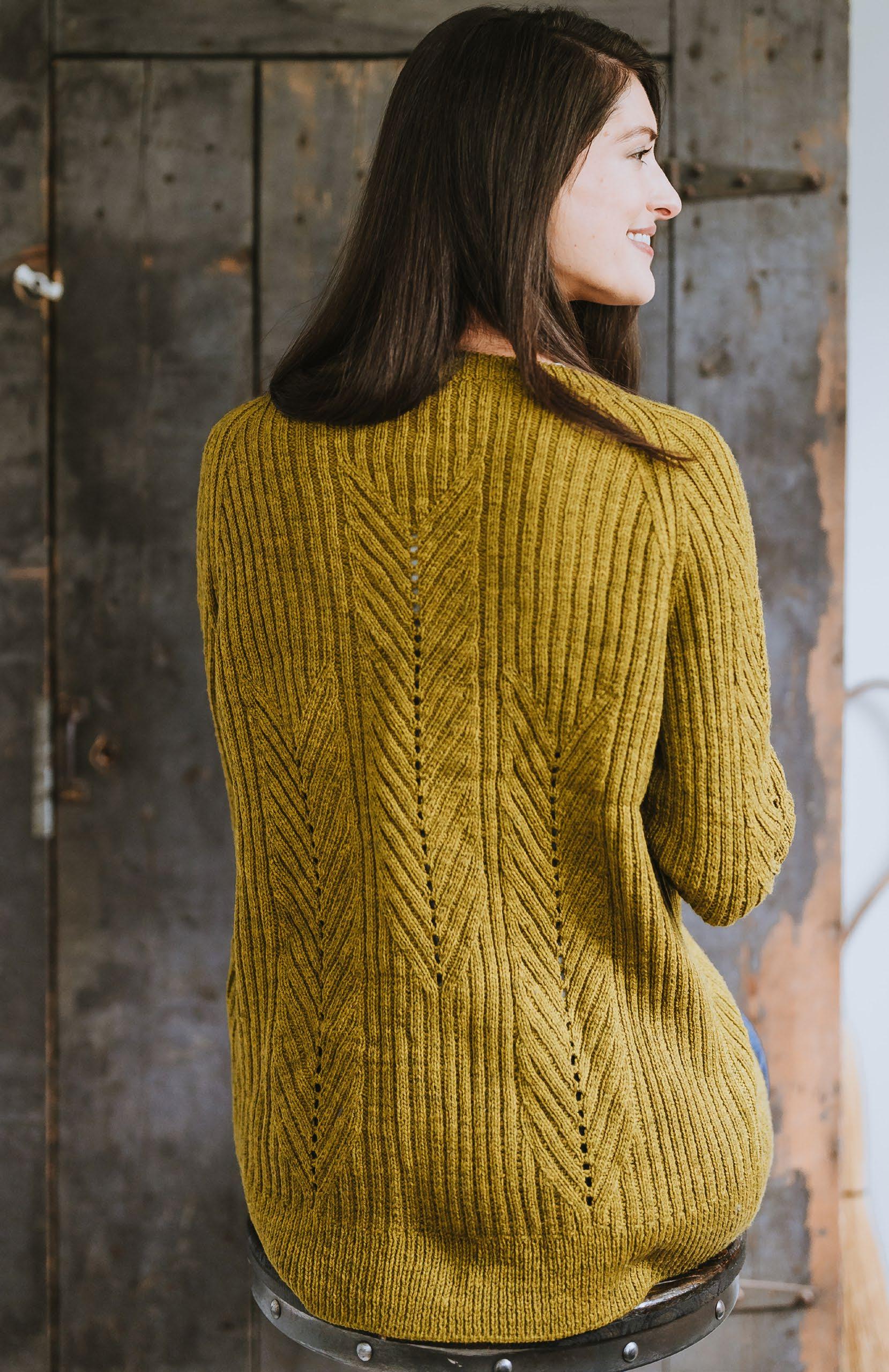 This lightweight cardigan is made in our soft and springy Weld. It’s worked from the bottom up in pieces and seamed, and the button band is picked up and worked after seaming.