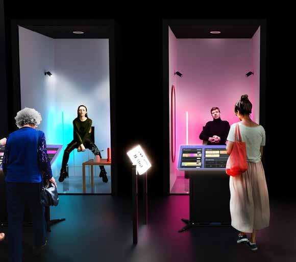 The power we hold is an area where the visitors really get to apply what they learnt. There are three booths with performers sitting still as models, one in each. The visitors are given instructions to create their own lighting scene in each of the booths, putting them in the shoes of lighting designers. They get the opportunity to control which lighting fixtures will be on in each scene, along with setting the color, temperature, and brightness to create a holistic picture.,