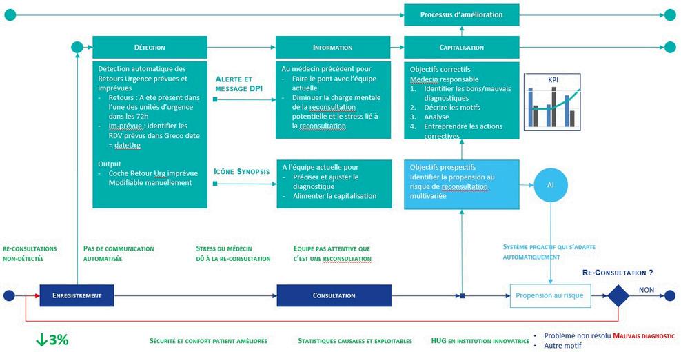 Proposition:créationd’unsystèmeinformatiqueintégréàDPIpermettantd’identifierlesretoursaux urgencesdansles72heuressuivantuneprécédenteconsultation,avectransmissionauxmédecins cadresafind’identifierlescausesduretour,etcréationd’unebasededonnéespermettantd’identifier entempsréellespistesd’améliorationdelaqualitédessoin.