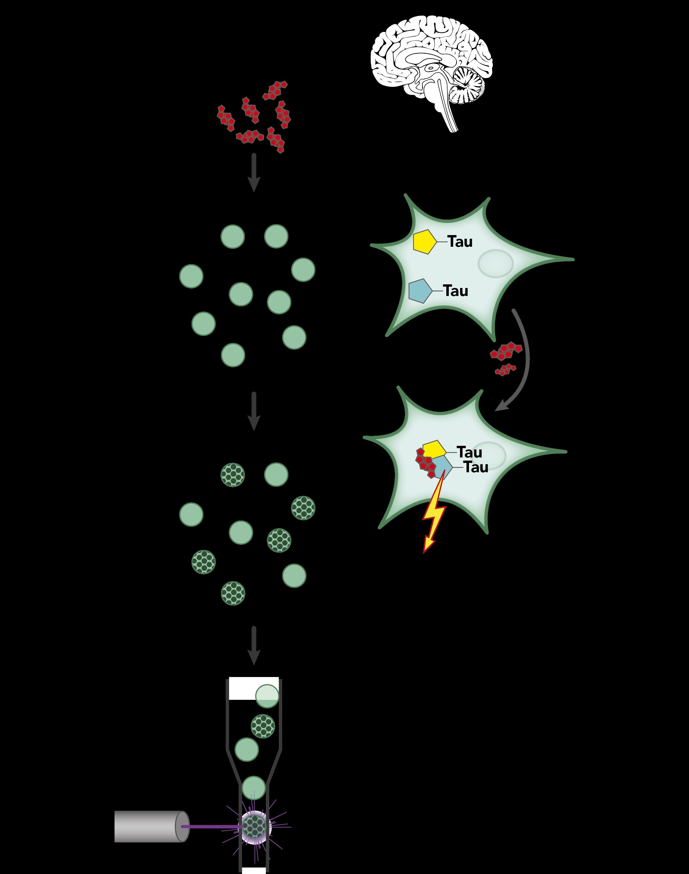 Nous avons développé un essai cellulaire ultrasensible pouvant détecter les formes toxiques de TAU capables de se propager Des cellules « biosenseurs » expriment une sonde composée d’un fragment de la protéine TAU modifiée, fusionné à une protéine reporter fluorescente Lorsqu’un échantillon humain est incubé sur ces cellules, les formes toxique de TAU contenues dans l’échantillon induisent l’agrégation de la sonde Ce processus d’agrégation peut être quantifié par imagerie ou cytométrie de flux (signal FRET) Cet essai cellulaire est sensible à des quantités minimes de TAU toxique, en femto grammes (10 15 ) par ml, le résultat est disponible en 24 heures
