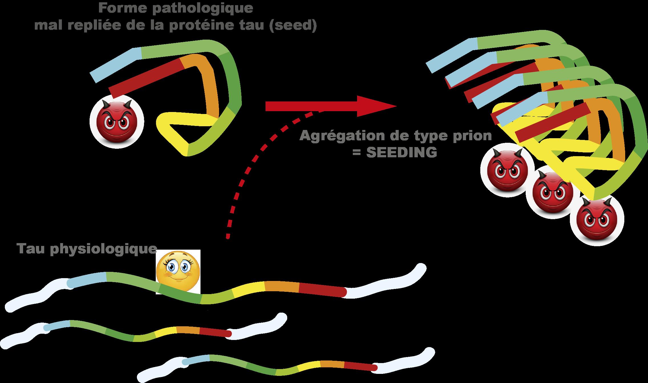 Lorsque ces formes toxiques de TAU entrent dans une cellule receveuse, elle sont capable de recruter la forme normale, de la faire s’agréger et la transformer en forme toxique, ce qui favorise la dissémination dans le cerveau On parle alors d’un processus de seedingou mécanisme de type prion