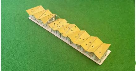 There are 3 types of infill to the triangles to make the roof richer: 01. Solid panel, various colours; 02. glazed; 03. open to the sky.