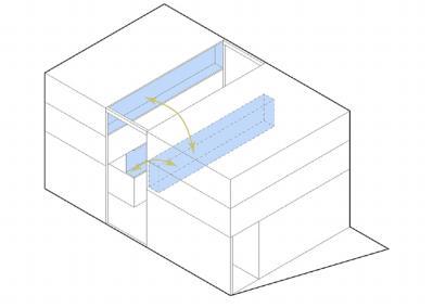 2)All portions above the “datum” level on the two main elevations (south and north) are glass walls, and the columns supporting the roof are wrapped in mirrors. This design gives the roof a floating appearance, emphasizes its importance, and creates a sense of transparency and openness throughout the space.