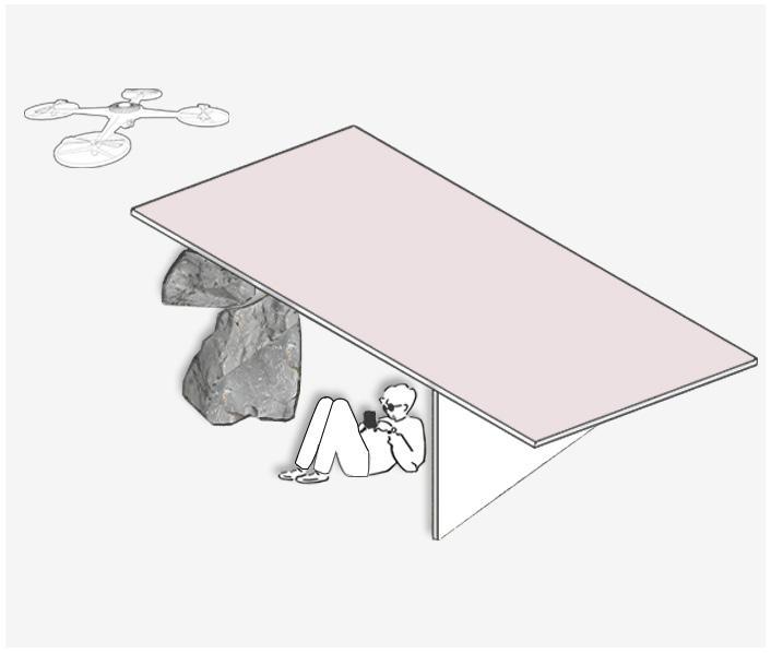 1. The first image illustrates the integration of natural rock formations with the rooftop structure to create a multi-functional space for rest and shelter. This design allows the space to be used for camping, providing refuge from the wind, and offering a tranquil environment for outdoor activities, thereby blending nature with architecture to enhance user experience in a natural setting.