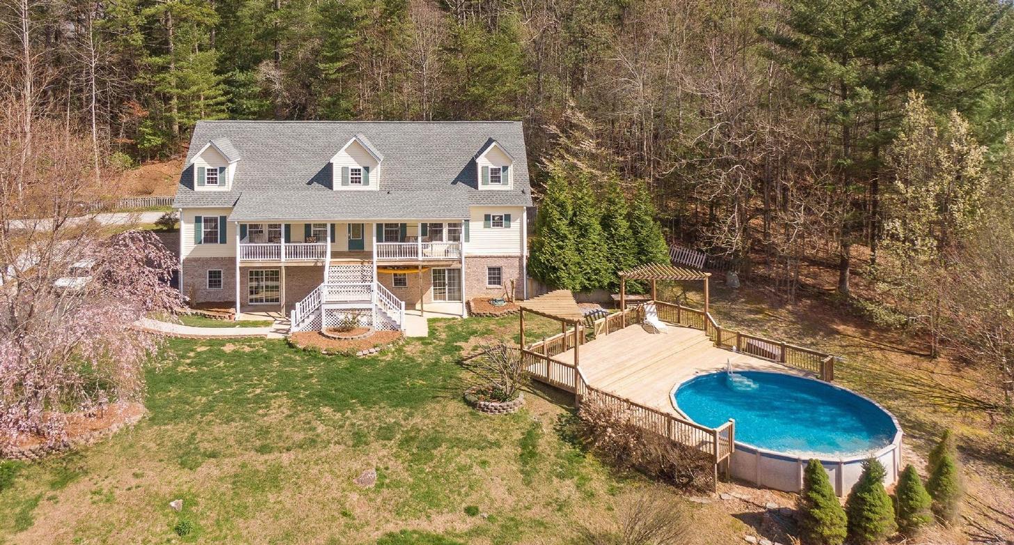 “wood stove”, bonus room with closet, workshop...and outdoor space. Main level has 9’ ceilings. Fabulous front porch as well as expansive rear decking. Sit on the front porch and enjoy the spectacular view, or overlook the pool. So much light in the house, and oh the storage! All this sits on a private 1.54 acre lot that feels like you’re “out”, but just 5 minutes to shopping and schools!