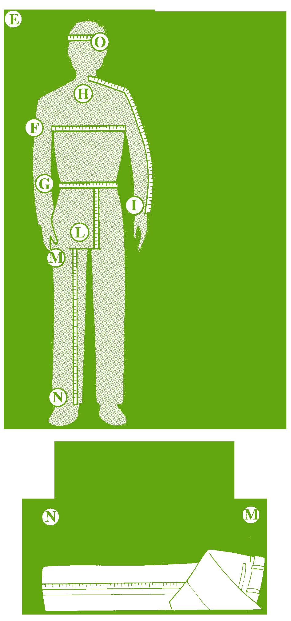 HEIGHT: Stand against a wall in stocking feet. Mark a point level with the top of the head. Measure from this point down to the floor. See measurement E.
