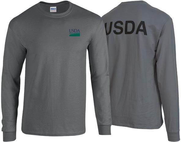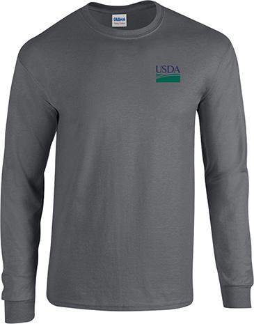 Gildan Long Sleeve T-Shirt 100% Heavy Cotton 5.3oz wt. fabric, classic width rib collar, ribbed cuffs Color: Charcoal Screen Printed USDA Logo / USDA Screen Print on Back