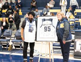 Toronto Raptors Superfan Nav Bhatia joined fans at the Humber North campus Nest on Jan. 14 to watch the Hawks beat their Fanshawe Falcons rivals. He was honoured during halftime and was given his own Humber Hawks jersey signed by all the varsity players during halftime at the Jan. 14 game. Bhatia is no stranger to special occasions, having received an honourary degree from Humber.
