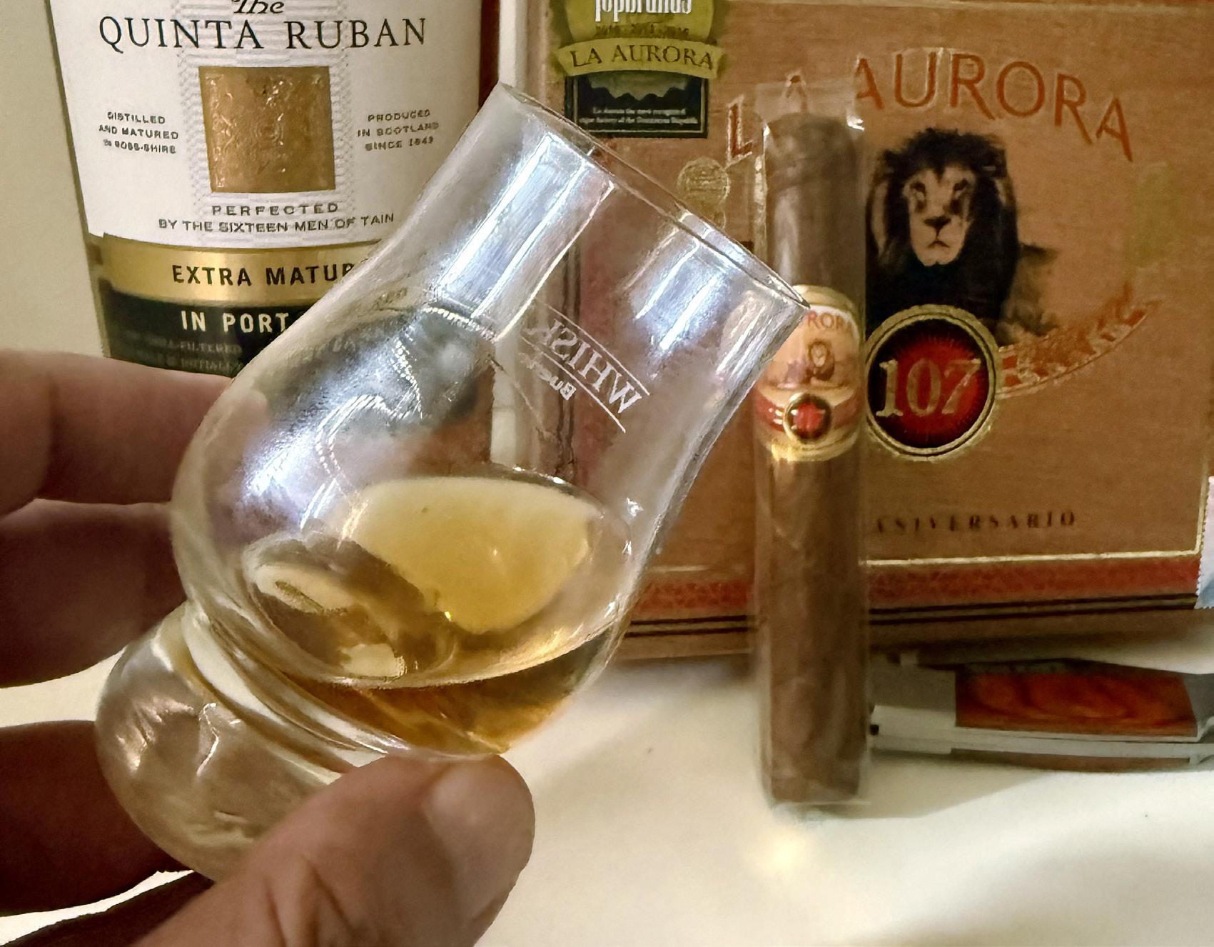 Ibegan this pairing one afternoon at home, during one of those moments of clarity when one decides to give free rein to intuition. I had smoked La Aurora’s 107 Original many times, and just as often, I had poured a glass of Quinta Ruban to let its dark sweetness speak for itself. But that afternoon, both crossed my mind with unexpected naturalness, as if they recognized each other. I understood then that it wasn’t about forcing an encounter, but about allowing it to happen.