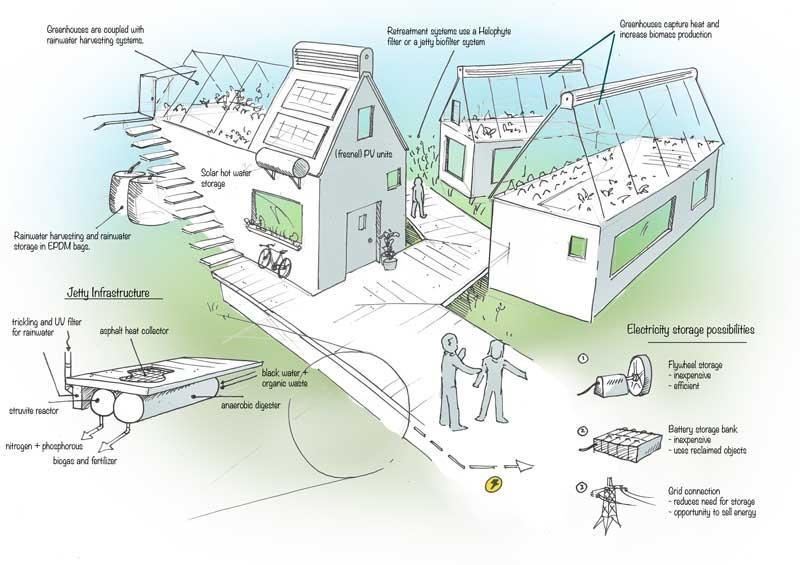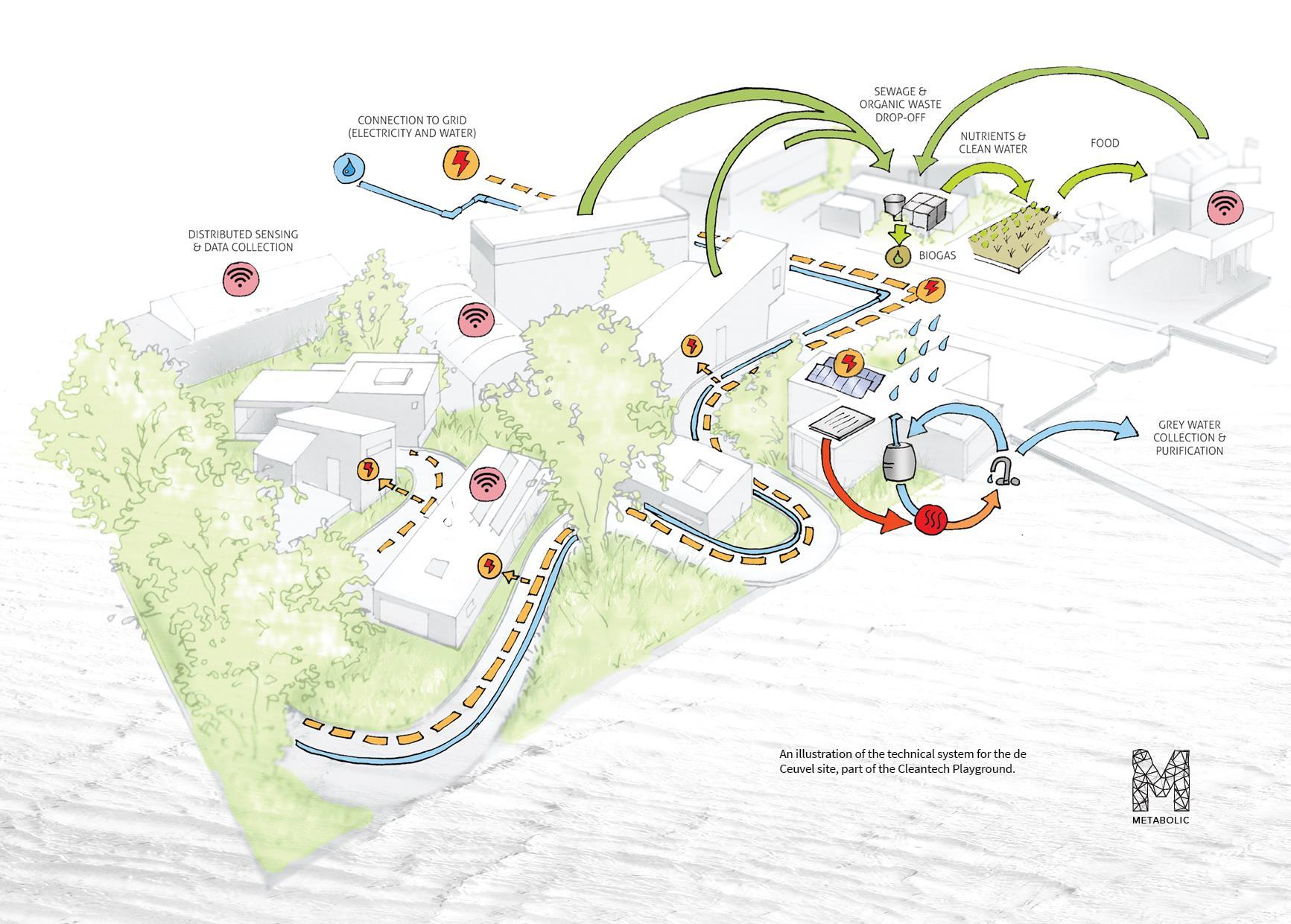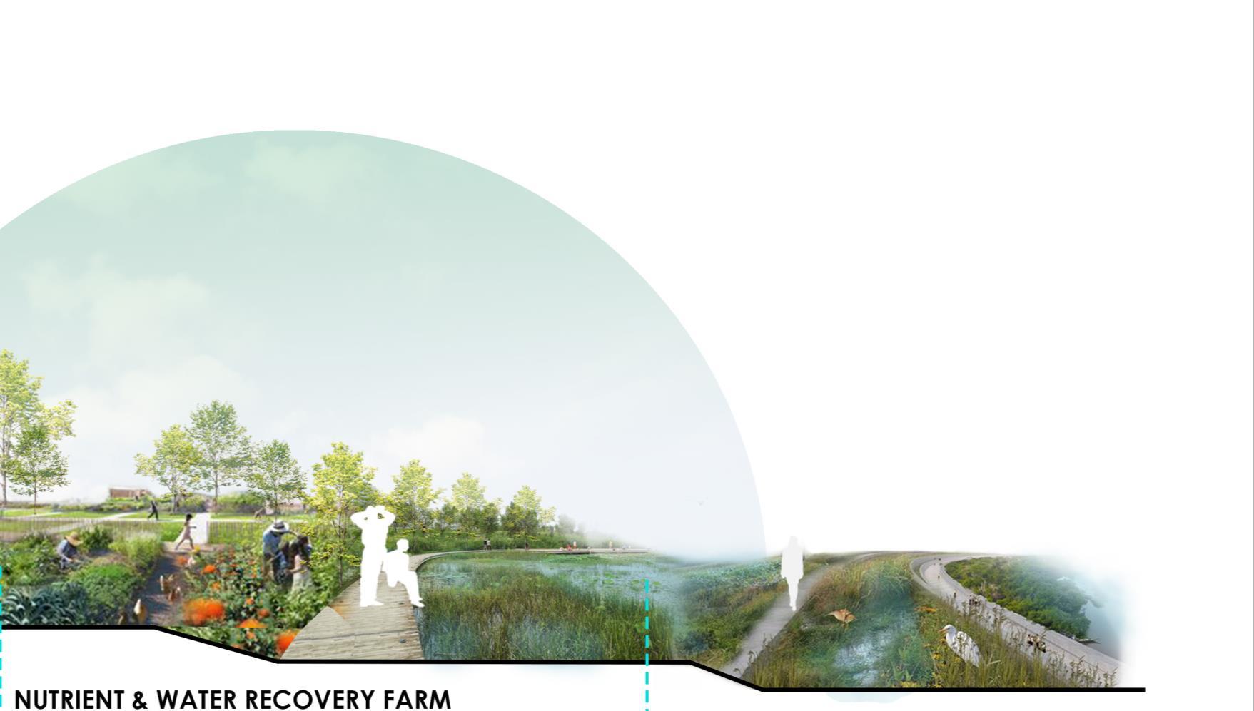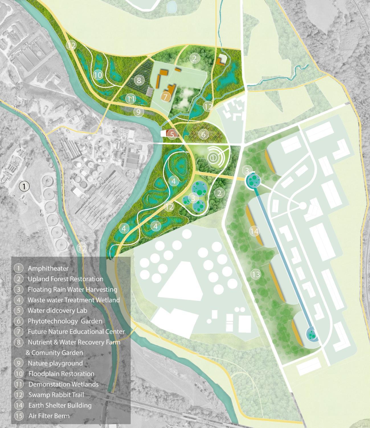 Water purification traditionally is not an activity that is open for public viewing. The introduction of a “purifying park”, includes a wastewater treatment wetland (WTW), reed bed, natural retention, underwater viewing ports, and a swamp rabbit trail overlooking the purifying process will provide unique opportunities for the public to learn more about the natural processes of water purification, reconnecting the visitor to what makes the most abundant resource in the world – water – clean and safe. The park itself is also completely interconnected, as the water recovered and treated from the WTW will flow through an irrigation system into the Demonstration Farm.