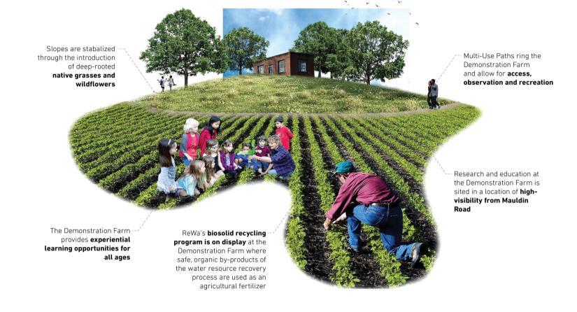 Demonstration Farm will be fertilized from organic by-products following the wastewater treatment process, offers hands-on learning, and shows the connection between resources – like water, land, and soil – and how we can mutually benefit by implementing them at various stages of the purification cycle.