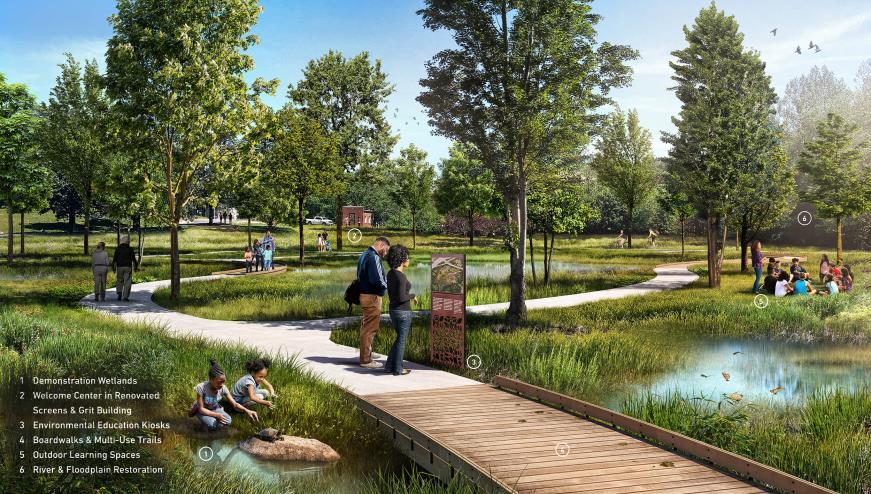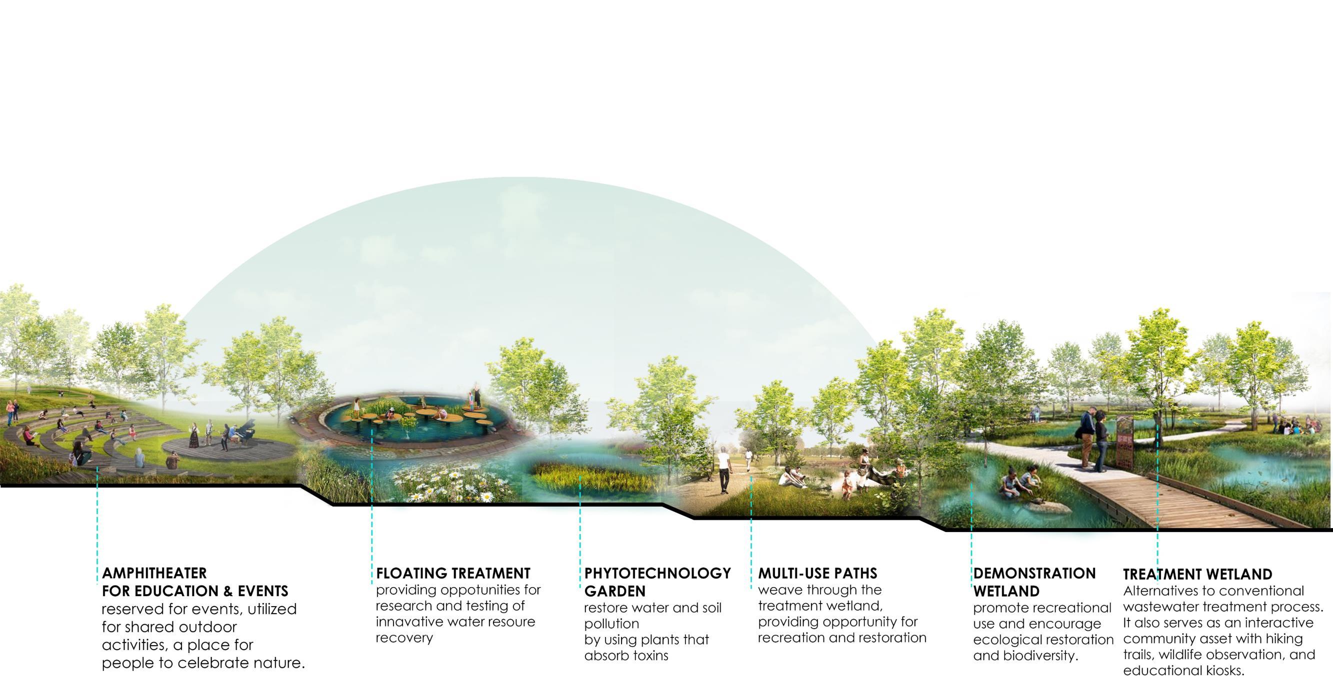 Master Plan offers multi-layered learning opportunities, educating visitors through interpretive signage along the paths about the demonstration wetlands, restored ecology, and purification process.