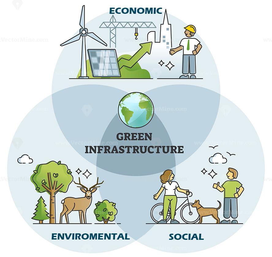 Infrastructure focuses on the benefits of green infrastructure in general. And then within the context of the environmental, social, and economic sectors individually. The text focuses primarily how to integrate green infrastructure into development with an overall nature led design approach being implemented in future developments. The aim of this design approach is to create a healthier environment for people and to create more resilient cities against increased disaster events caused by climate change.
