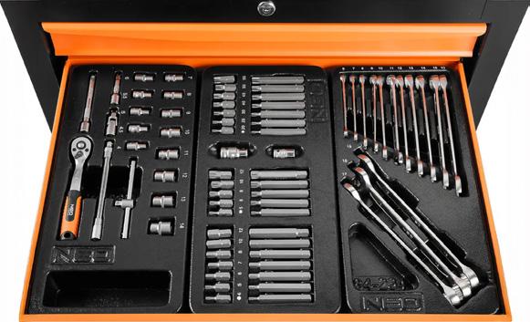 Verkfæraskápur frá NEO Tools með 117 vönduðum handverkfærum, skipulögð í útdraganlegum skúffum með innleggjum sem halda öllu á sínum stað. Sterkbyggð hönnun, læsiskerfi og hjól gera skápinn fullkominn fyrir verkstæðið, bílskúrinn og fagmenn sem vilja hafa allt á sínum stað. Frábær lausn fyrir þá sem vilja bæði geymslu og verkfærasett í einu. 5024491