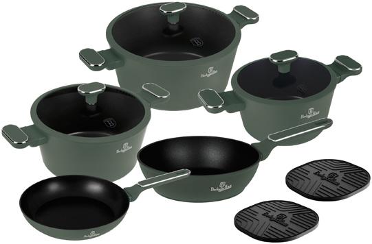 Pottasett Matte Green 10 stk. Steikingarpönnur Pottur með loki 2,5 l, pottur með sigtisloki 4,1 l, pottur með sigtisloki 6,1 l. 2 undirlagsmottur. 2009224