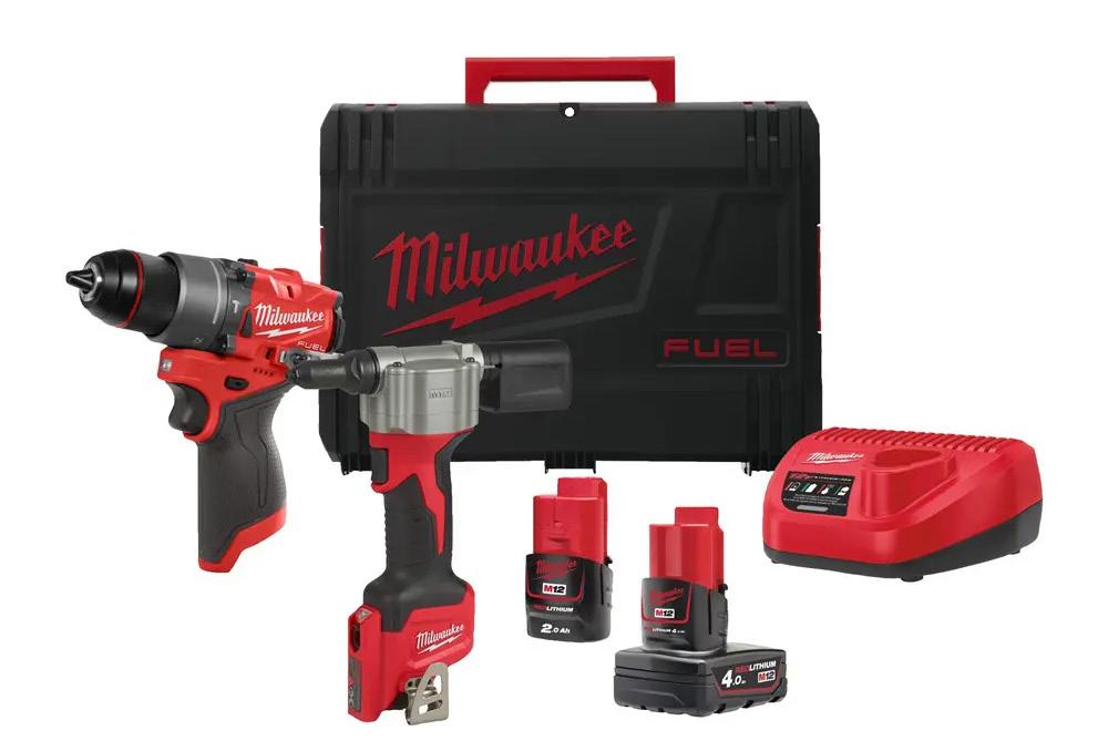 Sett, 12V Öflugt og sérhæft M12TM verkfærasett sem inniheldur M12 BDD borvél og M12 BPR hnoðbyssu. Fullkomin lausn fyrir fagaðila sem vinna mikið með málma og festingar, afhent með tveimur rafhlöðum, hleðslutæki og tösku. 5255980