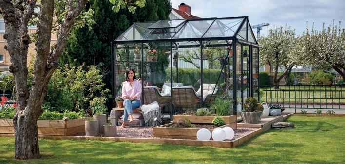 Et rummeligt drivhus, der giver god plads til planter og mennesker. Husets konstruktion er forstærket med en solid tagryg.