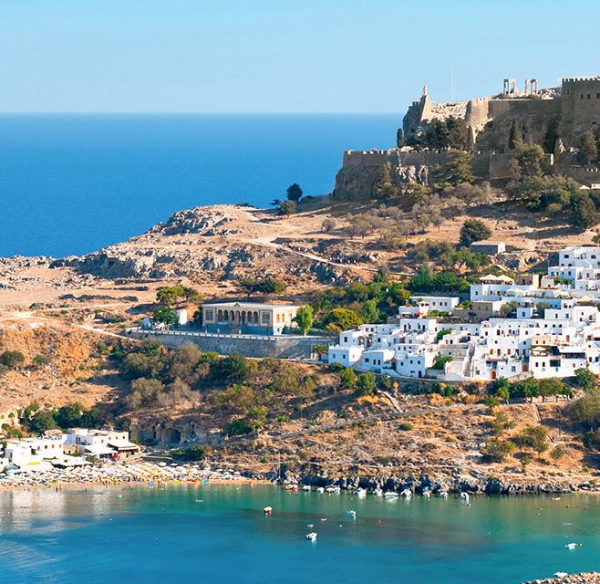 • Lindos: Betragtes som Rhodos‘ perle; med den tronende Akropolis, den fortryllende gamle bydel og de mest vidunderlige bugter på den populære ø.