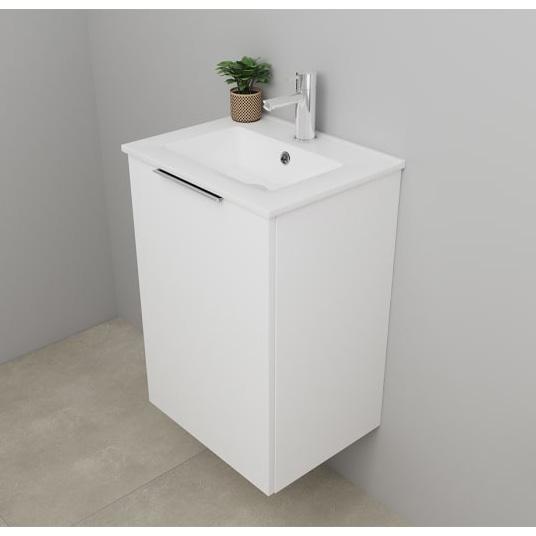 Møbelpakken har fokus på minimalisme og funktionalitet med hvid porcelænshåndvask og et væghængt underskab med god opbevaringsplads og flytbar hylde.