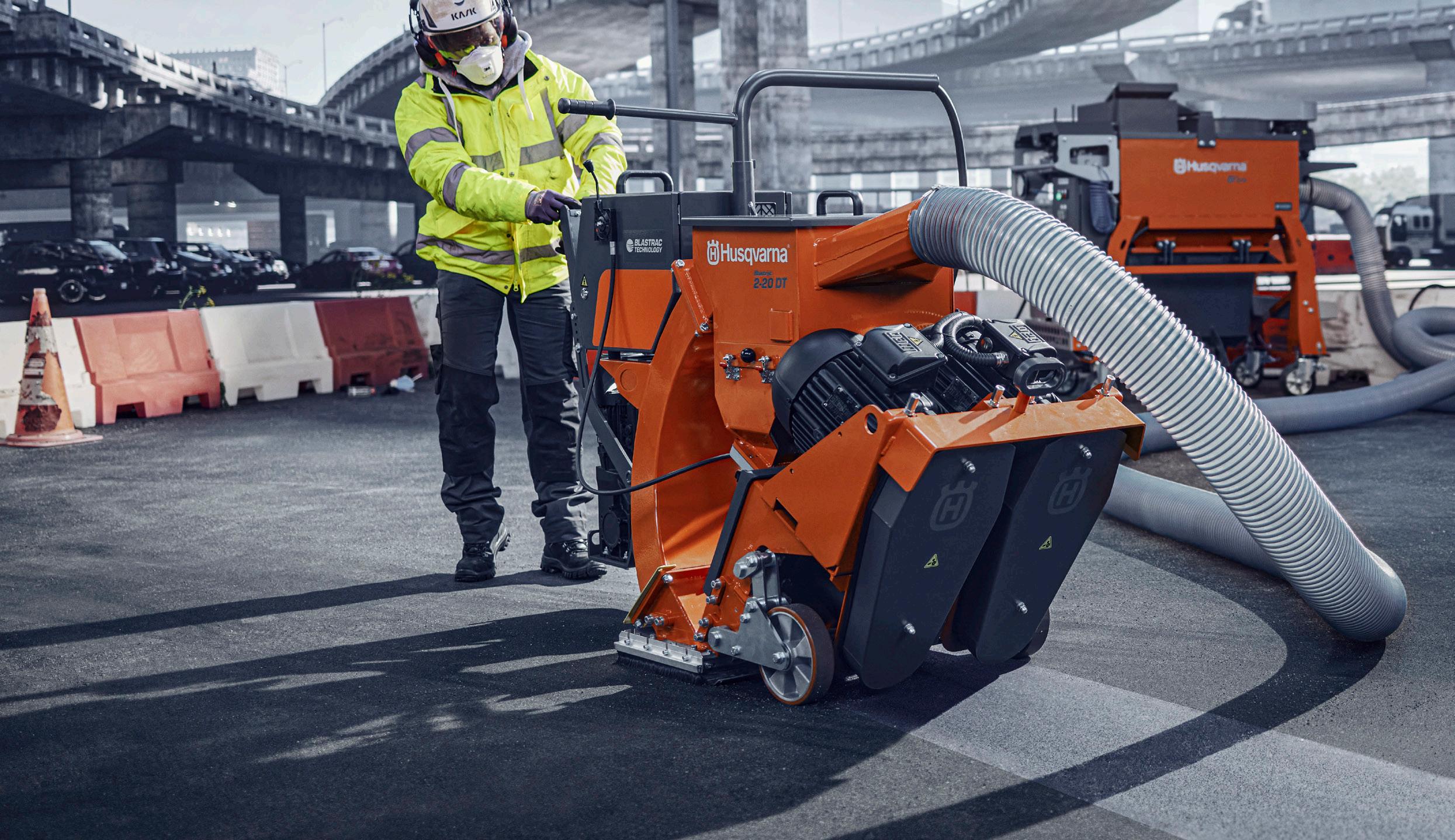 Tromlen placeres inde i maskinen, og når den tændes, genererer den roterende tromle en centripetal kraft, som "banker" fræseren mod overfladen, hvilket forårsager en mekanisk skærehandling. Støv og forurenende stoffer fjernes til en dedikeret Husqvarna-støvopsamler.