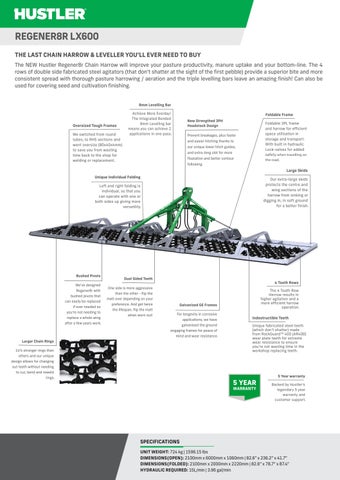 The NEW Hustler Regener8r Chain Harrow will improve your pasture productivity, manure uptake and your bottom-line. The 4 rows of double side fabricated steel agitators (that don’t shatter at the sight of the first pebble) provide a superior bite and more consistent spread with thorough pasture harrowing / aeration and the triple levelling bars leave an amazing finish! Can also be used for covering seed and cultivation finishing