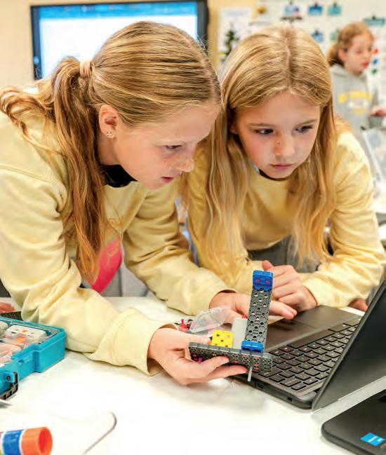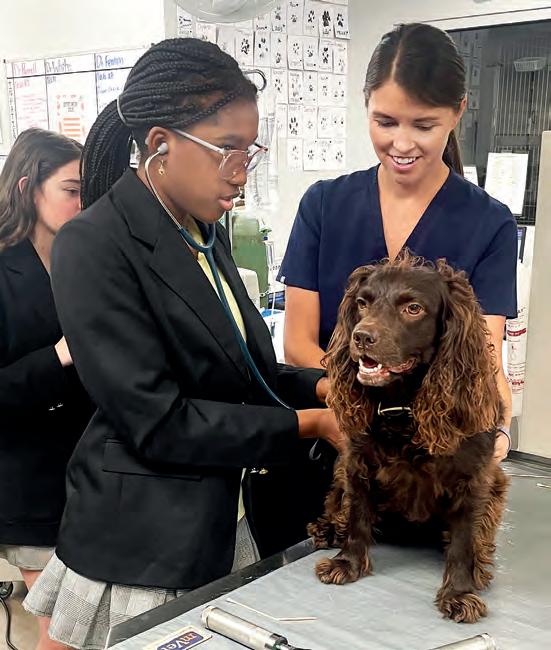 Bottom left: Ninth graders explored veterinary careers firsthand during a recent off-campus visit. Bottom right: Lower school girls build and prepare to program their own custom robots.