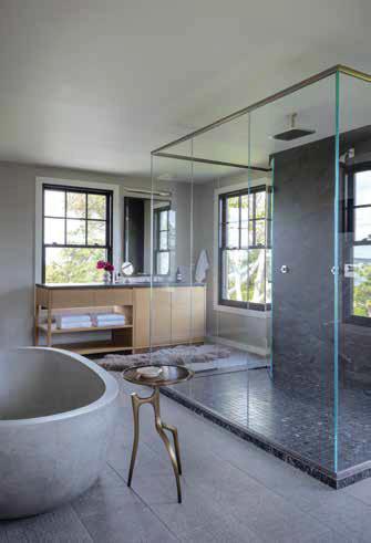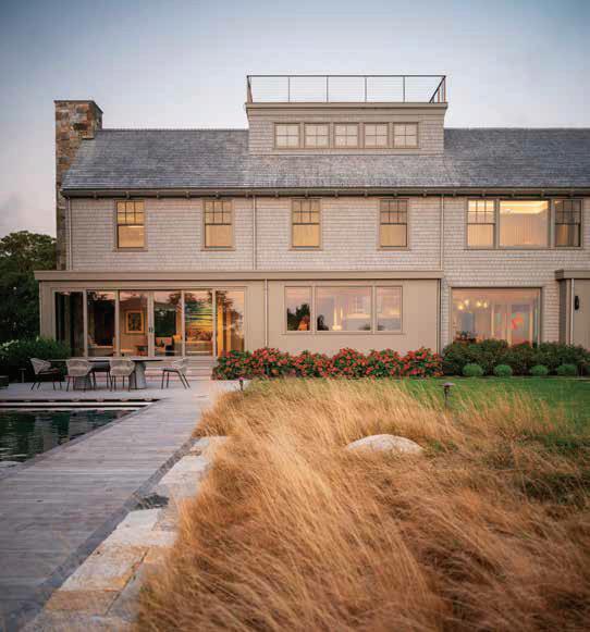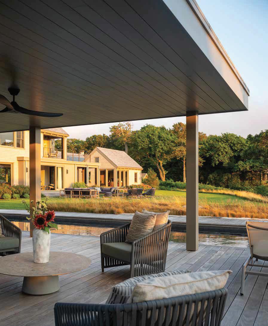 BELOW: In addition to the sleeping porch off the primary suite—which has views of both the bay and harbor—there’s also a widow’s walk offering panoramic vistas. LEFT: Throughout the property, the design team created moments to escape harsh elements like the sun and wind; the covered portion of the pool house is no exception.