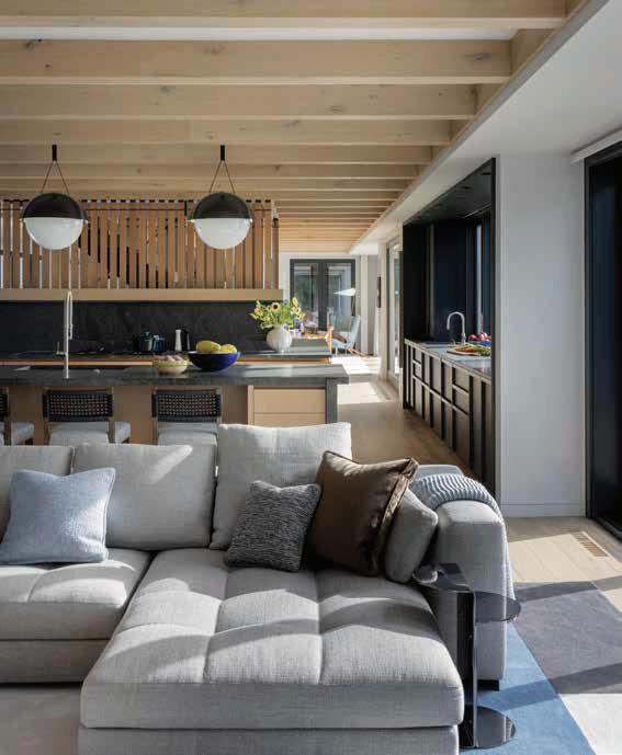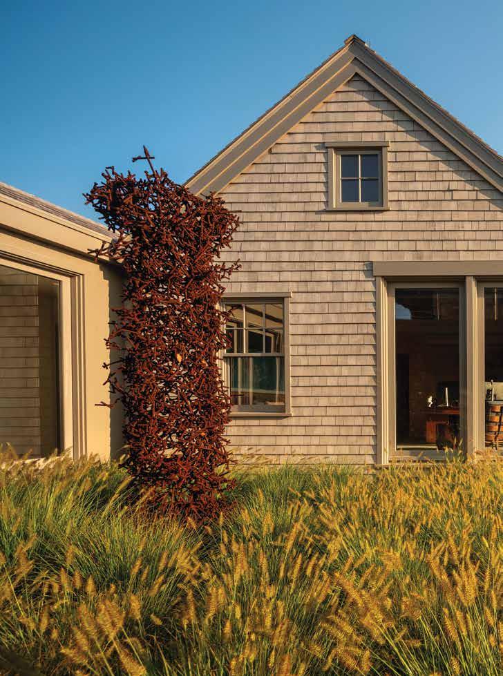 “We designed a long, linear home to maintain a visual connection to the water in every direction,” says Hutker Architects design principal Ryan Alcaidinho of the 8,000-square-foot residence. “The exterior language draws from the area’s historic architecture—the traditional proportions, weathered shingles, double-hung windows, rafter tails, and rhythmic window patterns—but is juxtaposed with modern detailing and glass connectors.”