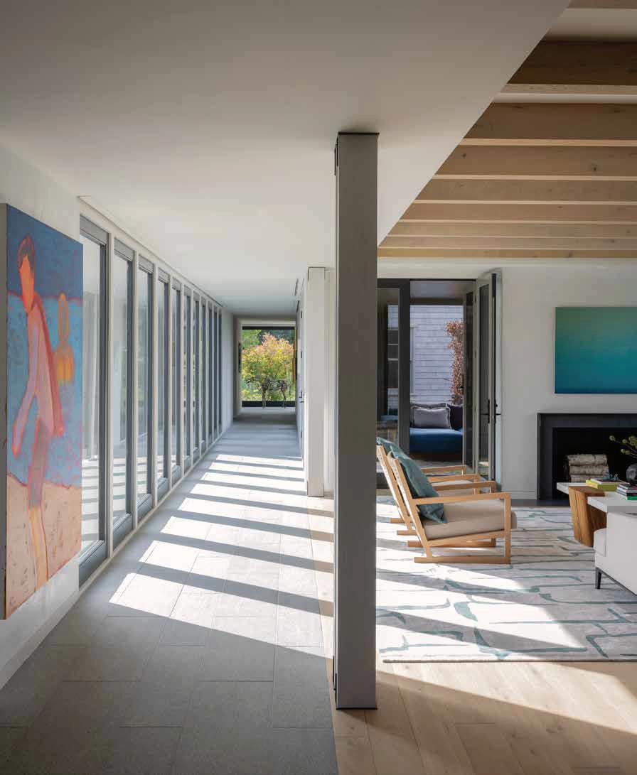 ABOVE: The kitchen is open to the family area, where there’s a sectional from Minotti. The oak-slat system separating the kitchen from the staircase is inspired by the sand fencing seen at the beach. LEFT: A painting by Katherine Bradford hangs in the corridor that runs alongside the living area, while a piece by Nicole Chesney hangs above the fireplace; the door to the left of the fireplace leads to the screened porch.