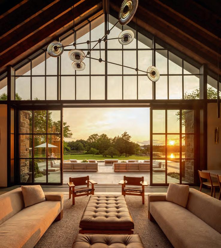 The redesigned and rebuilt structure now features steel and glass windows in the gables and glass pocket doors that open onto the pool patio. Parker also reimagined the guest house’s former driveway into an elegant gravel courtyard adjacent to the pool house.