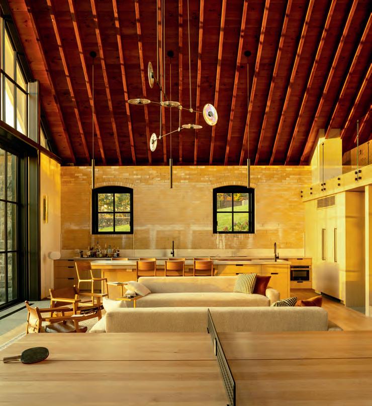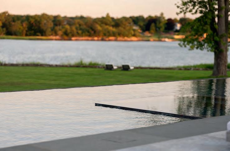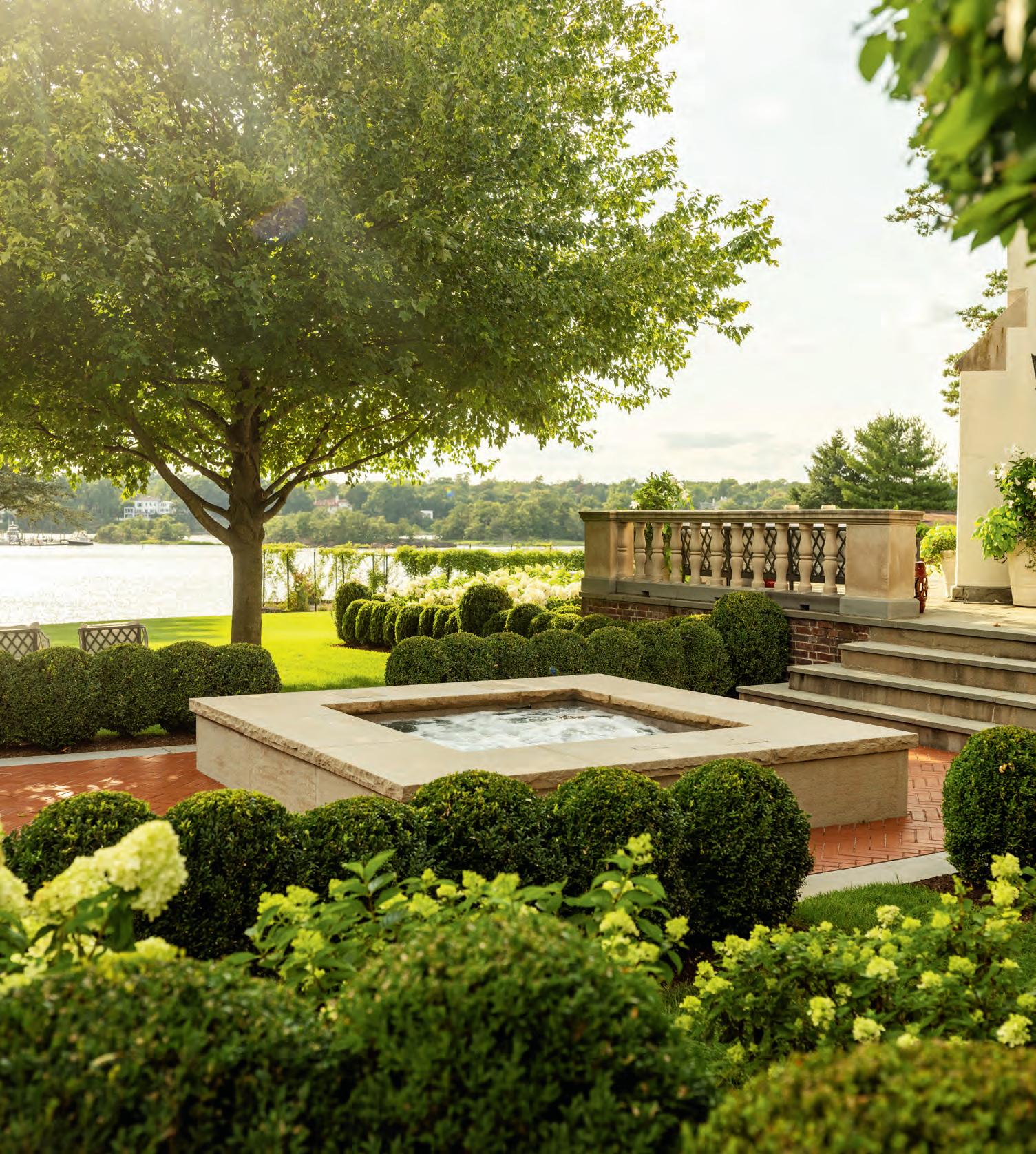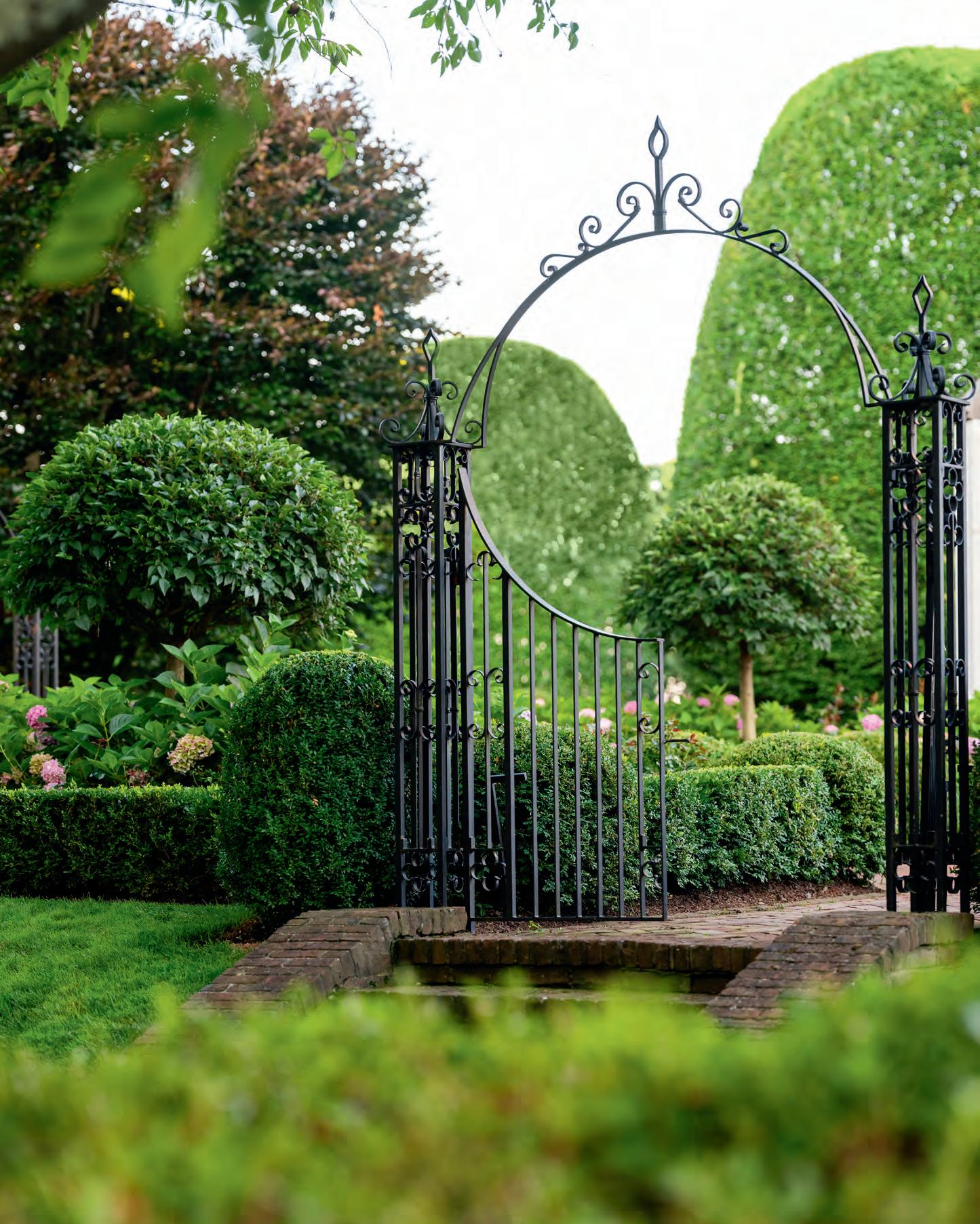 to create a continuous plane between planting beds and the driveway. Hutker Architects completely reimagined the inside of the former garage, creating a relaxed living space for entertaining and poolside lounging. Parker used boxwood and hydrangea throughout the garden: The boxwood for its deer resistance and evergreen structure and the hydrangea for their especially long seasonal interest and generous blossoms. In a waterside location, Parker loves the effect of an infinity-edge pool overlooking natural water. (opposite) Parker kept the original brick steps and iron arch leading to the rose garden and added new gates to help keep the deer out.