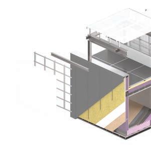 Alum num Facade Pane Cladding Rai Support Bracket Rigid nsu ation Weather Barrier WeatherBarrier Plywood Batt Insu ation GWB Concrete Slab Steel Decking C Jo st Wood Nailer GWB Spray Foam Insulation Steel Grate Pedistal Supports Cement Board Rigid nsu at on Plywood PVC Membrane Polycarbonate Pane Secondary Structure Felt Slip Sheet Tongue and Groove Wood Flooring