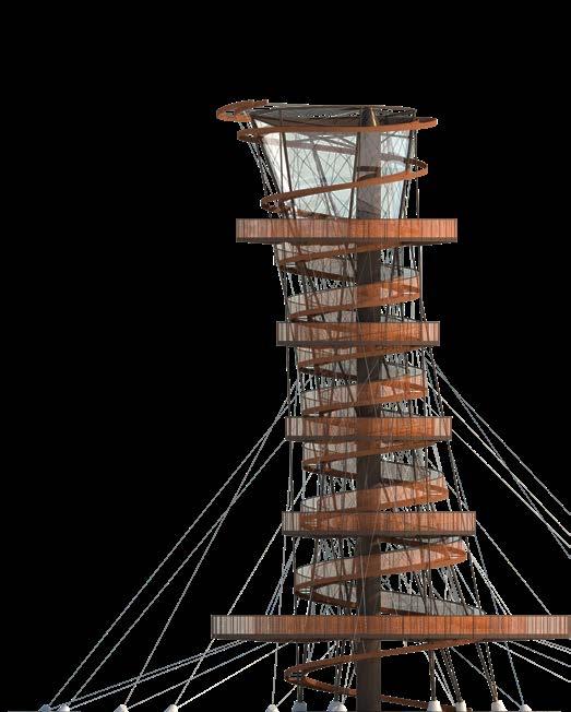 KURGI OBSERVATION TOWER COMBINES THE IDENTITY AND ATMOSPHERE OF NORTH VIDZEME BIOSPHERE RESERVE, THE WIDE LANDSCAPE OF SWAMP AND FOREST WITH ABUNDANT TREES IN A HORSE-FRIENDLY STRUCTURE. UNDERSTAND HOW BIG TREES BEHAVE IN NATURAL ENVIRONMENT AND TRANSLATE IT INTO A LANDMARK TO PROVIDE A SHELTER FOR HORSES. A WATER COLLECTING SYSTEM IS ATTACHED TO THE ENTIRE TOWER STRUCTURE TO PRESERVE THE UNIQUENESS OF THE SWAMP OF THE NORTH VIDZEME BIOSPHERE. THESE TWO GOALS ARE MERGED INTO A REMARQUABLE AND LIGHT CORTEN STEEL STRUCTURE (WITH TENSEGRITY SYSTEM), BLENDED IN WITH THE ENVIRONMENT. THE MULTIPLE LAYERS OF CABLES ARE THE WATER COLLECTING SYSTEM, WHICH ALSO SUPPORTS THE DISK PLATFORMS WHICH ARE PROVIDING THE SHADE FOR HORSES. THE 35-METER TOWER IS SHAPED TO EMBRACE THE CIRCULAR MOVEMENT OF A 360° OPEN VIEW EXPERIENCE. THE FIRST PLATFORM ARE WIDER THAN THE UPPER PLATFORMS. IT CONTRIBUTES TO STABILIZING THE STRUCTURE. ANOTHER FUN PURPOSE OF THE FIRST PLATFORM IS TO ALLOW VISITORS TO WATCH THE HORSES TO DRINK THE COLLECTED WATER OF THE TOWER IN A SHORT DISTANCE WITHOUT DISTURBING THEM. FIRST FLOOR PLATFORM IS WIDER THAN THE UPPER FLOORS TO STABILIZE THE TOWER, IN THE MEANTIME PROVIDING UNDERNEATH A LARGE SPACE FOR HORSES.