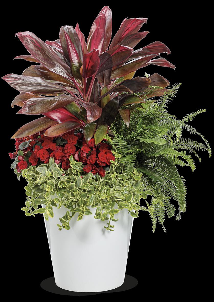 Our premium Remember Me container recipe for part sun combines lush foliage plants with vibrant blooms. It includes ‘Red Sister’ cordyline, Solenia® Scarlet begonia, ‘Kimberley Queen’ fern and Mezoo™ Trailing Red dorotheanthus.