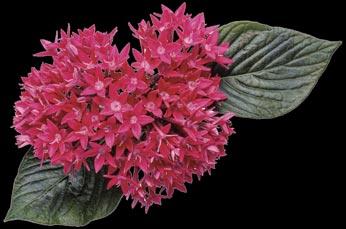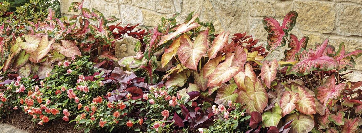 Outlined below, L to R: SUNSTAR® Red Pentas, MEZOO™ Trailing Red Aptenia, HEART TO HEART® ‘Bold ‘N Beautiful’ Caladium, ISLAND GIANTS™ ‘Coffee Cups’ Colocasia, COLORBLAZE® Chocolate Drop Coleus and BOMBSHELL® Coral Pink Mandevilla